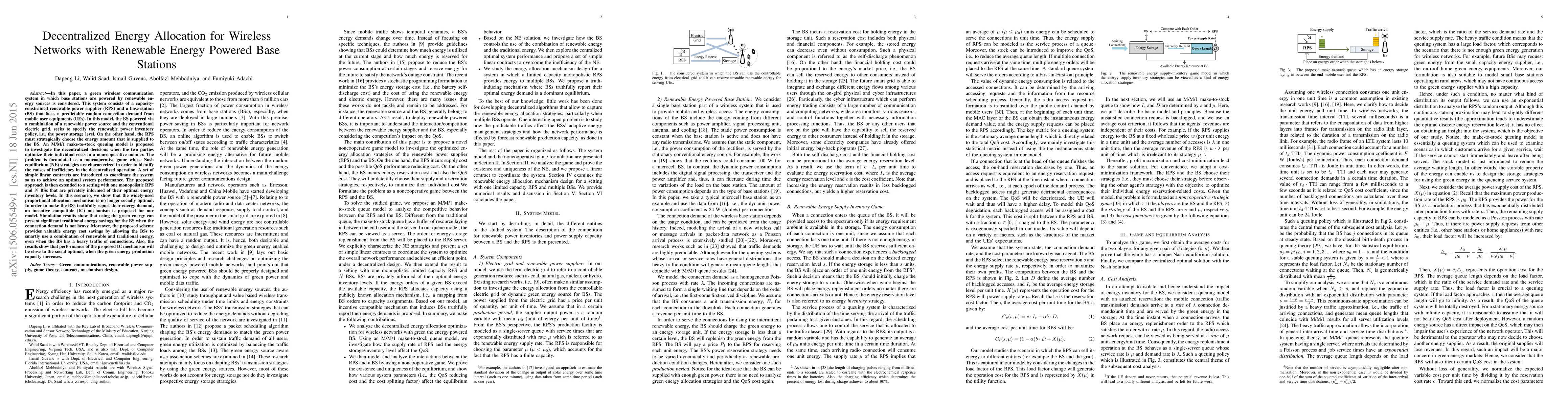 This paper explores a green wireless communication system where base stations are powered by renewable energy, focusing on decentralized energy allocation strategies. It formulates the problem as a noncooperative game to identify inefficiencies and proposes linear contracts to achieve optimal performance, while also introducing an incentive mechanism to ensure truthful reporting of energy demand.