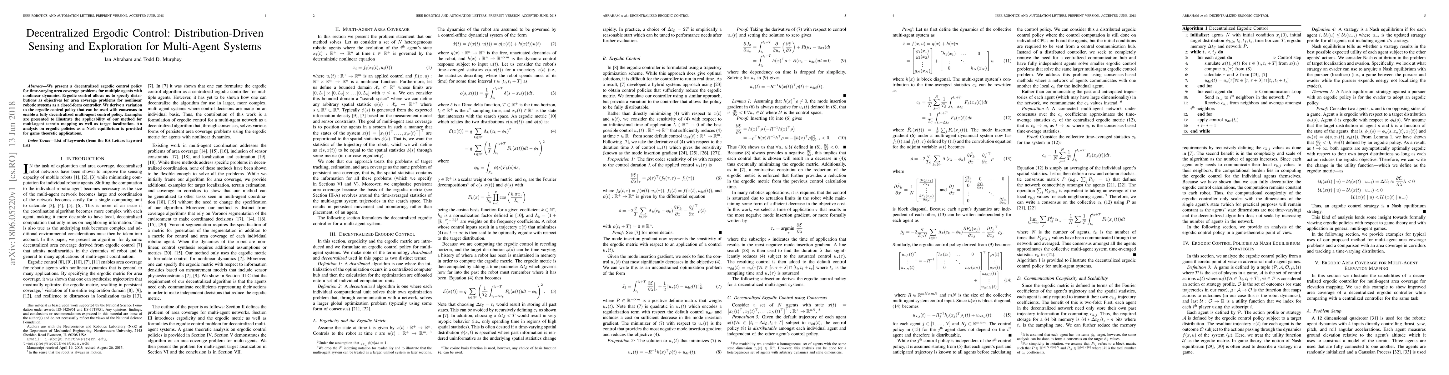 This paper proposes a decentralized ergodic control policy for multi-agent systems to address time-varying area coverage, enabling distribution-driven sensing and exploration. The method is demonstrated through applications in terrain mapping and target localization.