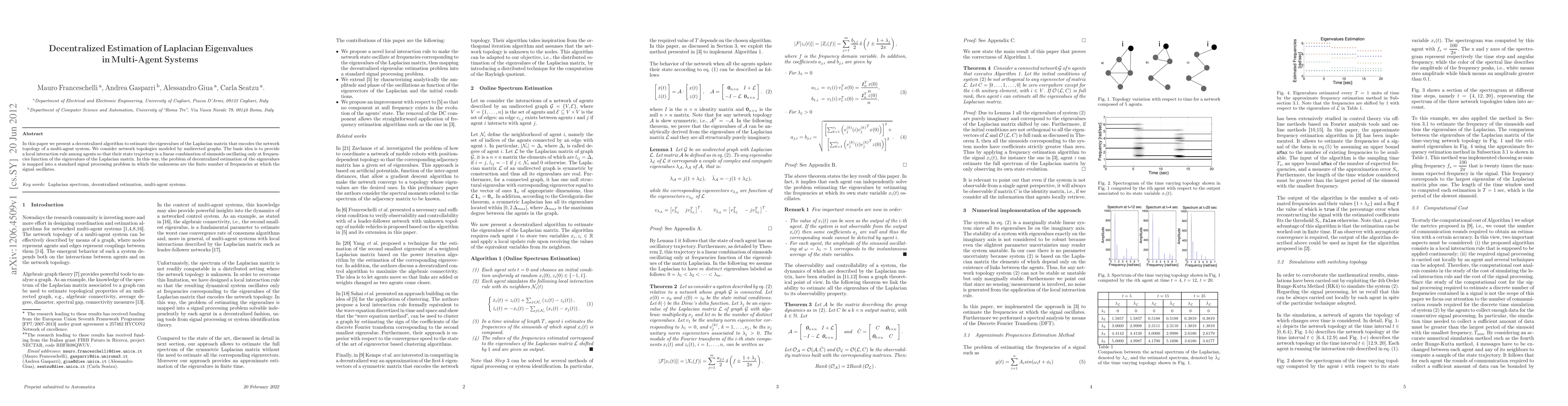 A decentralized algorithm is presented to estimate Laplacian eigenvalues in multi-agent systems, transforming the problem into a signal processing challenge. The method enables agents to synchronize their states using sinusoidal oscillations at frequencies determined by the eigenvalues.