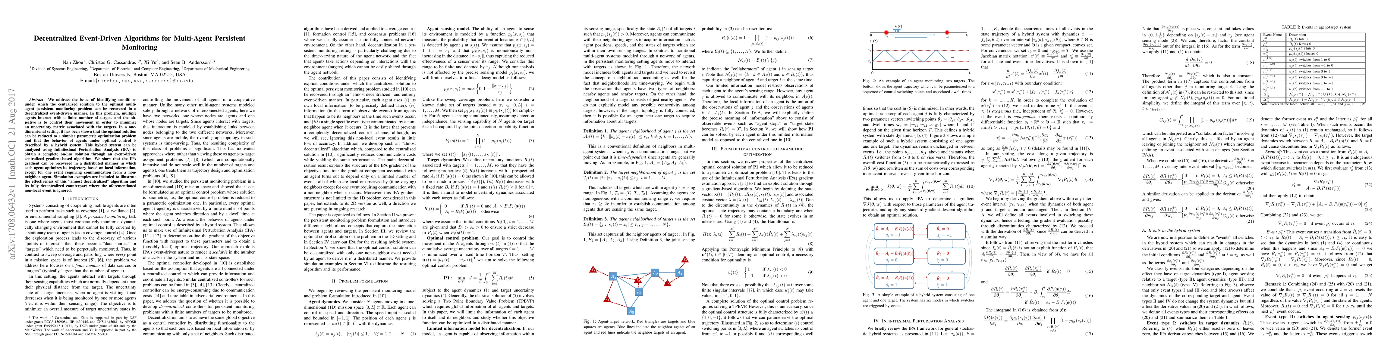 This paper proposes decentralized event-driven algorithms for multi-agent persistent monitoring, showing how centralized optimal solutions can be approximated through distributed optimization using local information and minimal non-local communication. Simulation results demonstrate the effectiveness of both "almost decentralized" and fully decentralized approaches.