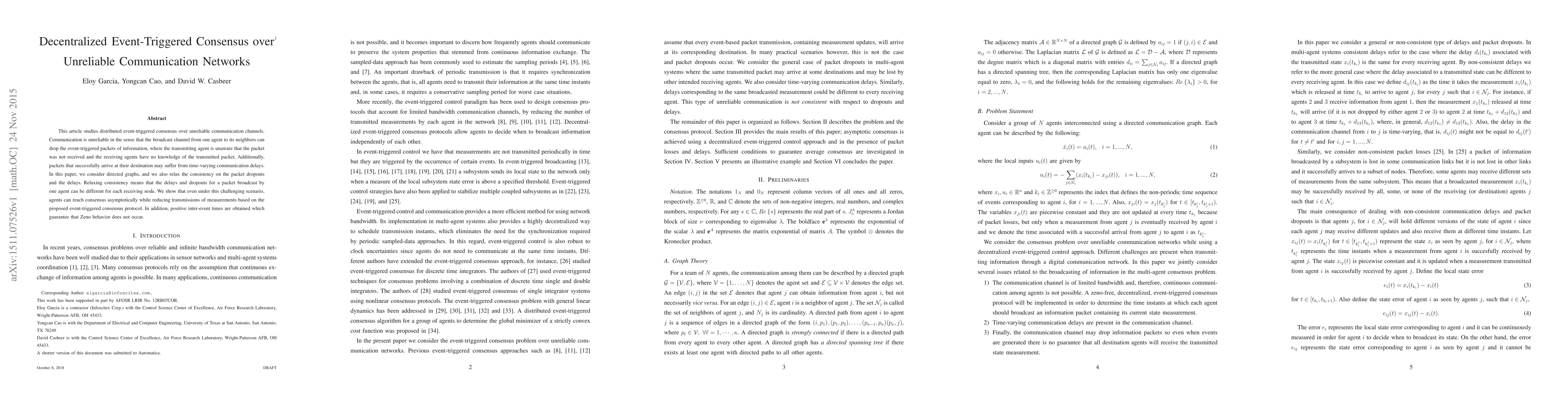 This paper investigates distributed event-triggered consensus among agents over unreliable communication networks, where packet dropouts and time-varying delays are possible. It proposes a protocol that allows agents to reach consensus asymptotically while minimizing unnecessary transmissions and avoiding Zeno behavior.