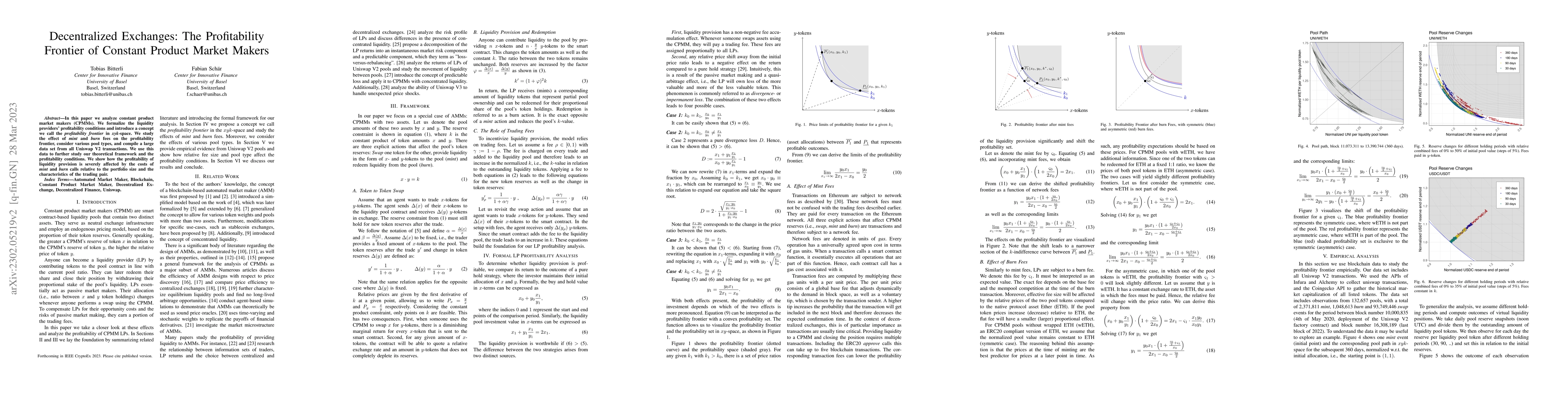 In this paper we analyze constant product market makers (CPMMs). We formalize the liquidity providers' profitability conditions and introduce a concept we call the profitability frontier in the xyk-space. We study the effect of mint and burn fees on the profitability frontier, consider various pool types, and compile a large data set from all Uniswap V2 transactions. We use this data to further study our theoretical framework and the profitability conditions. We show how the profitability of liquidity provision is severely affected by the costs of mint and burn events relative to the portfolio size and the characteristics of the trading pair.