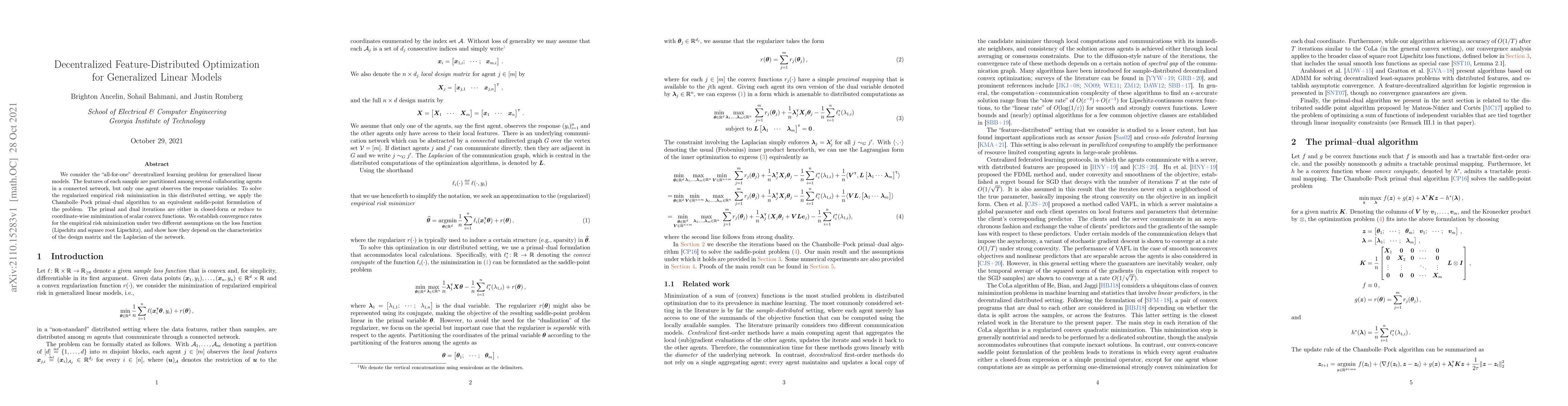 We consider the "all-for-one" decentralized learning problem for generalized linear models. The features of each sample are partitioned among several collaborating agents in a connected network, but only one agent observes the response variables. To solve the regularized empirical risk minimization in this distributed setting, we apply the Chambolle--Pock primal--dual algorithm to an equivalent saddle-point formulation of the problem. The primal and dual iterations are either in closed-form or reduce to coordinate-wise minimization of scalar convex functions. We establish convergence rates for the empirical risk minimization under two different assumptions on the loss function (Lipschitz and square root Lipschitz), and show how they depend on the characteristics of the design matrix and the Laplacian of the network.