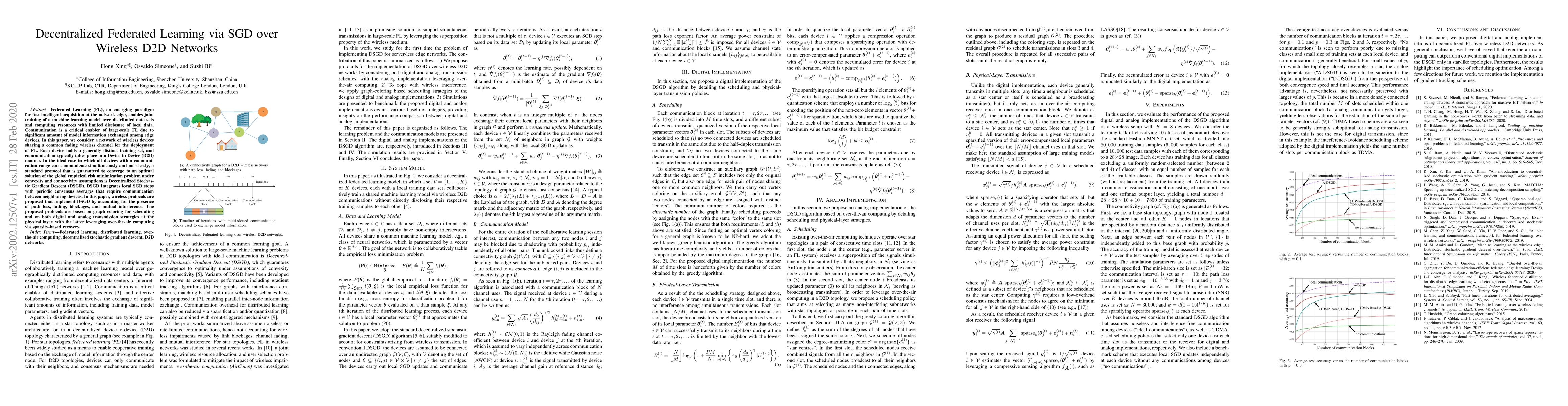 Federated Learning (FL), an emerging paradigm for fast intelligent acquisition at the network edge, enables joint training of a machine learning model over distributed data sets and computing resources with limited disclosure of local data. Communication is a critical enabler of large-scale FL due to significant amount of model information exchanged among edge devices. In this paper, we consider a network of wireless devices sharing a common fading wireless channel for the deployment of FL. Each device holds a generally distinct training set, and communication typically takes place in a Device-to-Device (D2D) manner. In the ideal case in which all devices within communication range can communicate simultaneously and noiselessly, a standard protocol that is guaranteed to converge to an optimal solution of the global empirical risk minimization problem under convexity and connectivity assumptions is Decentralized Stochastic Gradient Descent (DSGD). DSGD integrates local SGD steps with periodic consensus averages that require communication between neighboring devices. In this paper, wireless protocols are proposed that implement DSGD by accounting for the presence of path loss, fading, blockages, and mutual interference. The proposed protocols are based on graph coloring for scheduling and on both digital and analog transmission strategies at the physical layer, with the latter leveraging over-the-air computing via sparsity-based recovery.
