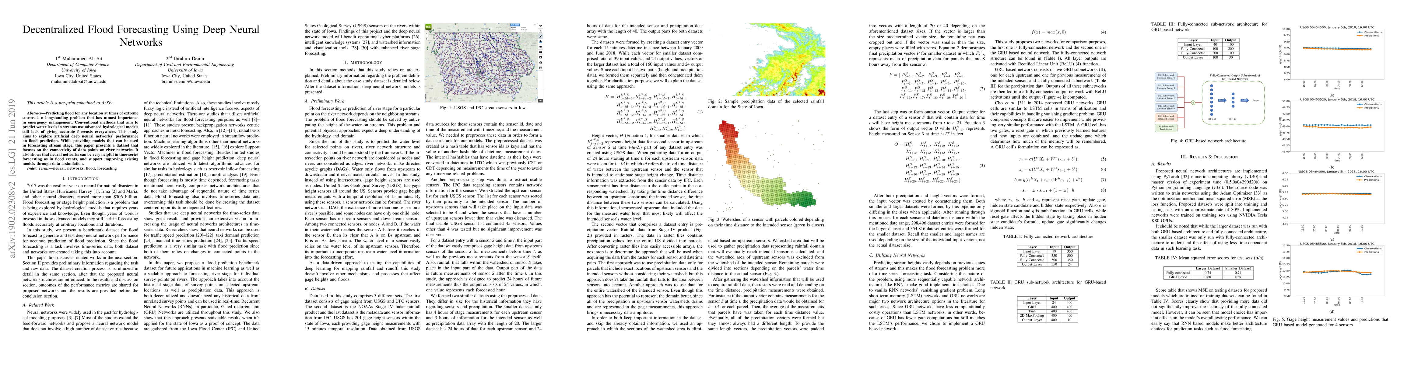 This study investigates the use of deep neural networks for decentralized flood forecasting, demonstrating their potential to improve accuracy over traditional hydrological models. The research also presents a dataset emphasizing river network connectivity and highlights the effectiveness of neural networks in time-series forecasting for flood events.