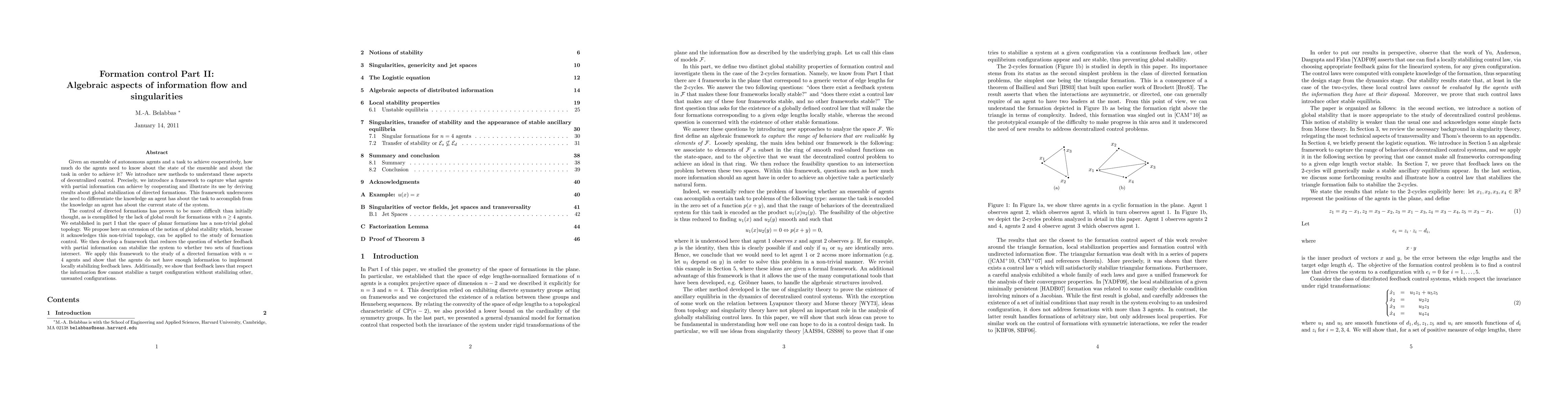 Given an ensemble of autonomous agents and a task to achieve cooperatively, how much do the agents need to know about the state of the ensemble and about the task in order to achieve it? We introduce new methods to understand these aspects of decentralized control. Precisely, we introduce a framework to capture what agents with partial information can achieve by cooperating and illustrate its use by deriving results about global stabilization of directed formations. This framework underscores the need to differentiate the knowledge an agent has about the task to accomplish from the knowledge an agent has about the current state of the system. The control of directed formations has proven to be more difficult than initially thought, as is exemplified by the lack of global result for formations with n \geq 4 agents. We established in part I that the space of planar formations has a non-trivial global topology. We propose here an extension of the notion of global stability which, because it acknowledges this non-trivial topology, can be applied to the study of formation control. We then develop a framework that reduces the question of whether feedback with partial information can stabilize the system to whether two sets of functions intersect. We apply this framework to the study of a directed formation with n = 4 agents and show that the agents do not have enough information to implement locally stabilizing feedback laws. Additionally, we show that feedback laws that respect the information flow cannot stabilize a target configuration without stabilizing other, unwanted configurations.