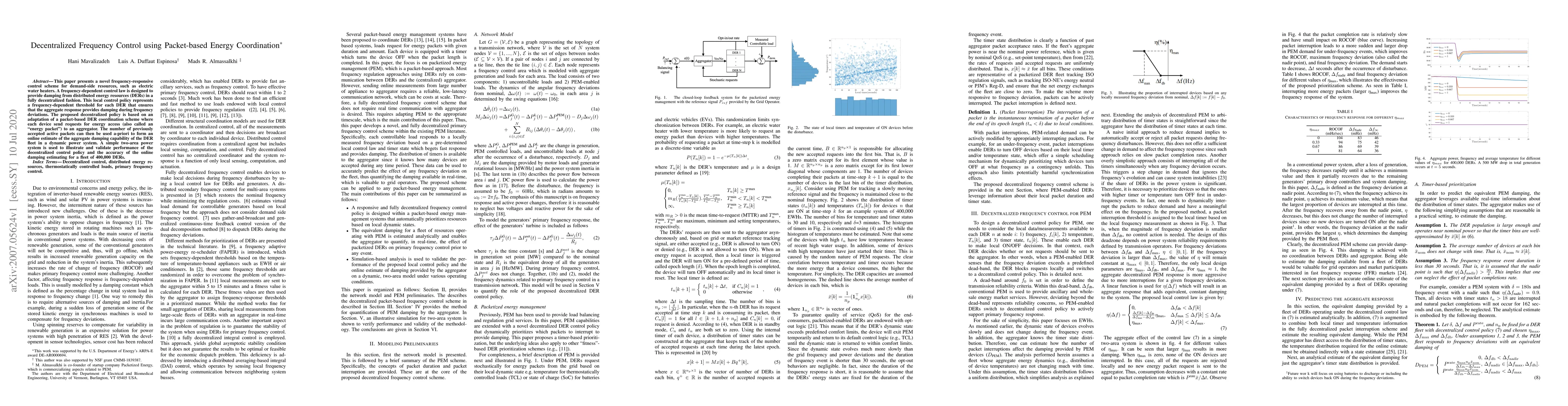 This paper introduces a decentralized frequency control scheme using packet-based coordination for demand-side resources like electric water heaters, ensuring damping during frequency deviations through a local control policy. The approach employs an online estimate of aggregate damping capability based on energy packet requests, validated in a two-area power system with 400,000 distributed energy resources.