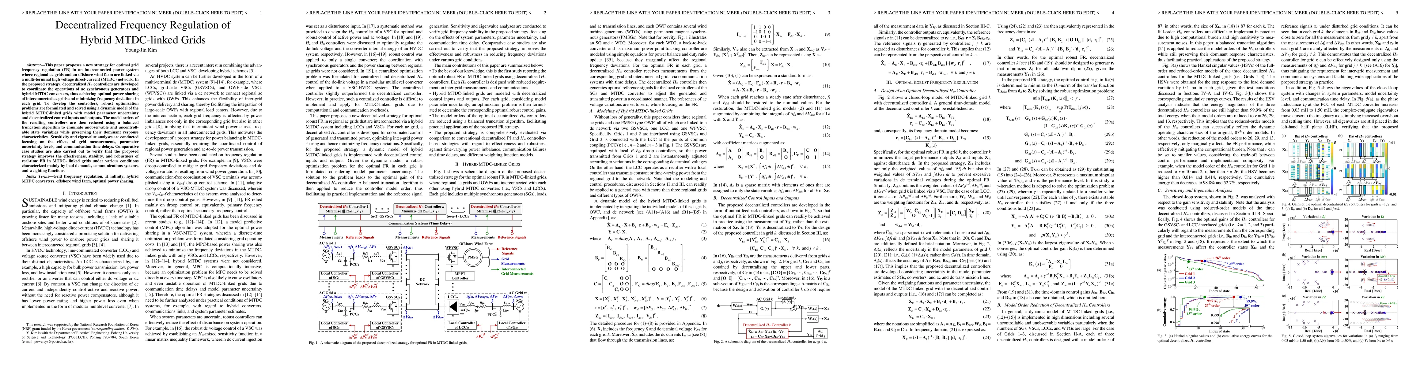 This paper proposes a new strategy for optimal grid frequency regulation (FR) in an interconnected power system where regional ac grids and an offshore wind farm are linked via a multi-terminal high voltage direct-current (MTDC) network. In the proposed strategy, decentralized H-infinity controllers are developed to coordinate the operations of ac synchronous generators and hybrid MTDC converters, thus achieving optimal power sharing of interconnected ac grids and minimizing frequency deviations in each grid. To develop the controllers, robust optimization problems are formulated and solved using a dynamic model of the hybrid MTDC-linked grids with model parameter uncertainty and decentralized control inputs and outputs. The model orders of the resulting controllers are then reduced using a balanced truncation algorithm to eliminate unobservable and uncontrollable state variables while preserving their dominant response characteristics. Sensitivity and eigenvalue analyses are conducted focusing on the effects of grid measurements, parameter uncertainty levels, and communication time delays. Comparative case studies are also carried out to verify that the proposed strategy improves the effectiveness, stability, and robustness of real-time FR in MTDC-linked grids under various conditions characterized mainly by load demands, communications systems, and weighting functions.