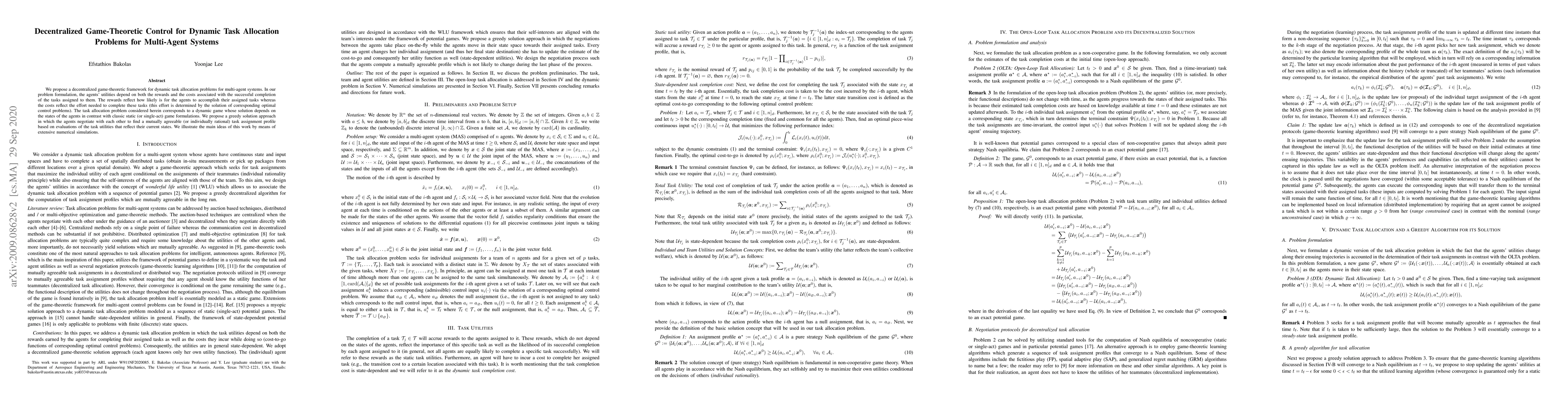 This paper introduces a decentralized game-theoretic framework for dynamic task allocation in multi-agent systems, where agents' utilities are influenced by both task rewards and effort costs. The proposed solution approach involves agents negotiating to find a mutually agreeable task assignment based on their current states, validated through numerical simulations.