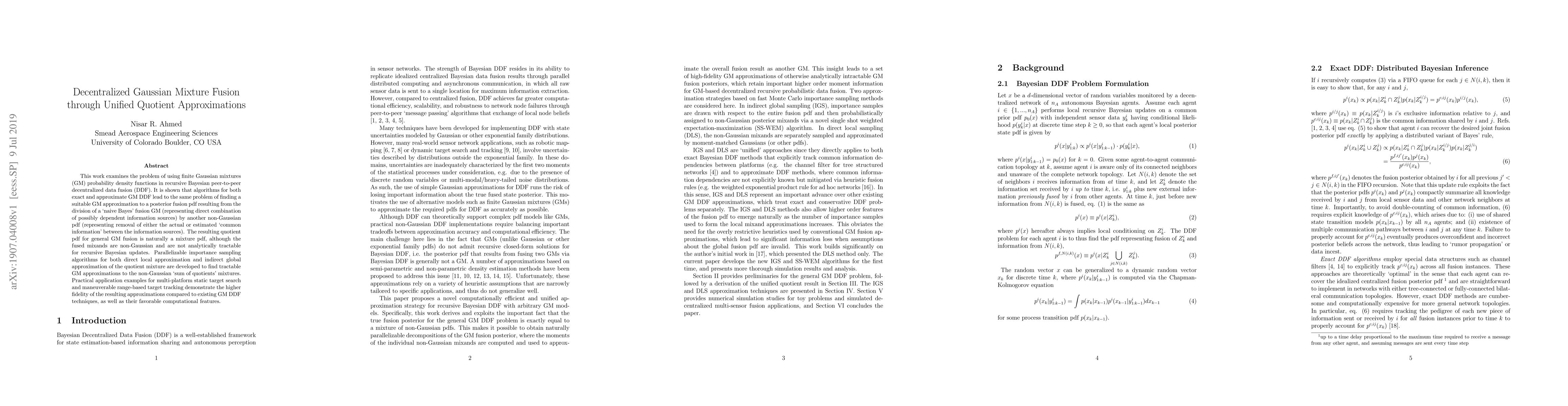 This paper explores decentralized data fusion using finite Gaussian mixtures, focusing on finding suitable Gaussian mixture approximations for quotient mixtures arising from recursive Bayesian updates. It proposes parallelizable importance sampling algorithms for both local and global approximations, demonstrating improved accuracy and computational efficiency in applications like multi-platform target search and tracking.