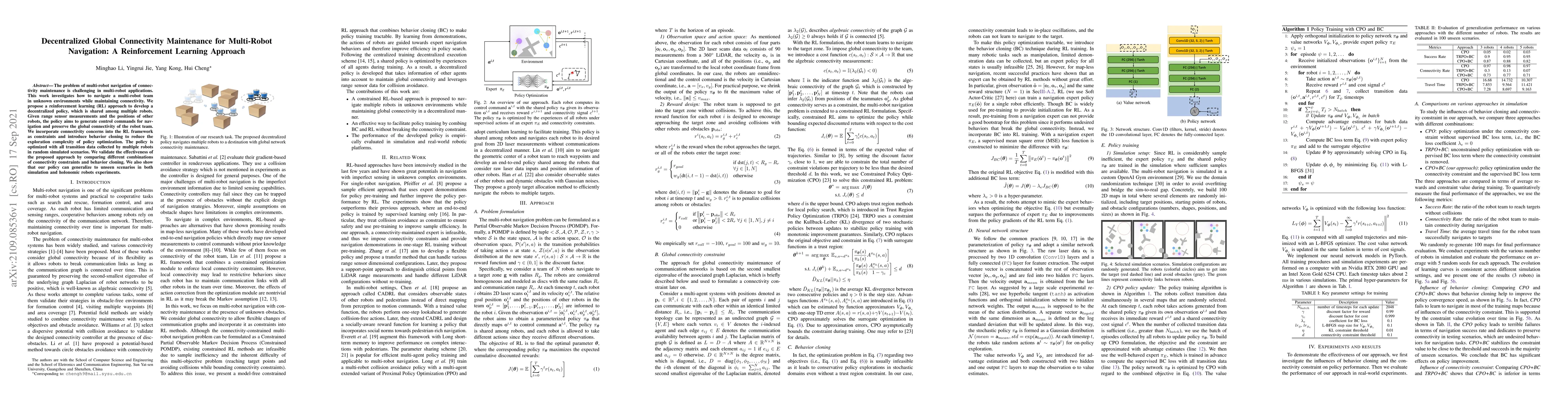 This paper proposes a decentralized reinforcement learning approach for maintaining global connectivity in multi-robot navigation through unknown environments. The developed policy incorporates connectivity constraints and uses behavior cloning to optimize navigation commands, demonstrating effectiveness and generalization across various simulated and real-world scenarios.