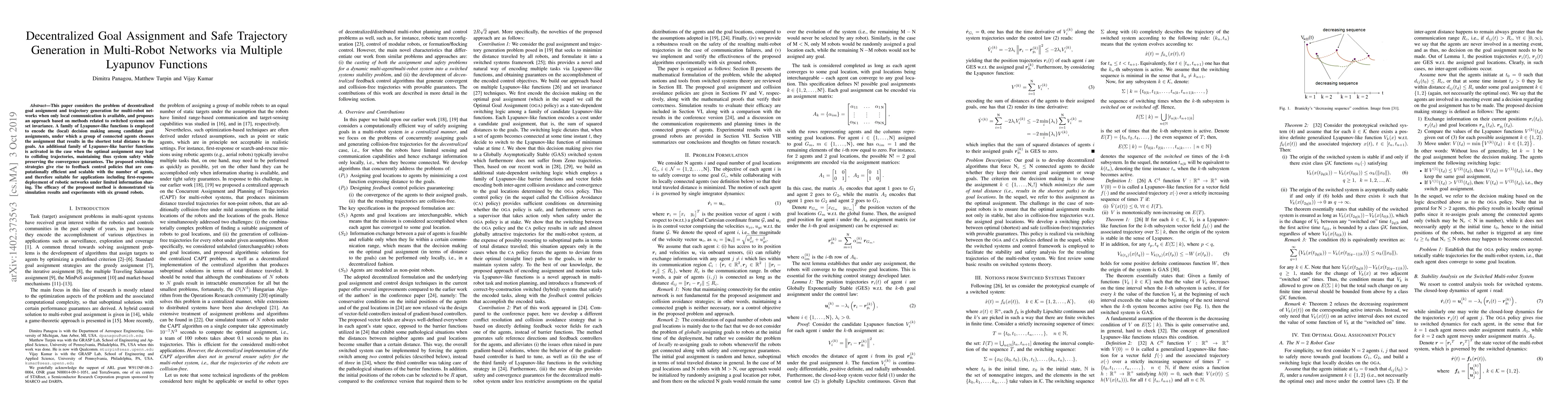 This paper proposes a decentralized method for goal assignment and safe trajectory generation in multi-robot networks using local communication, employing Lyapunov-like functions for optimal goal selection and barrier functions to prevent collisions. The approach is scalable and demonstrated effective through simulations and experiments with ground robots.