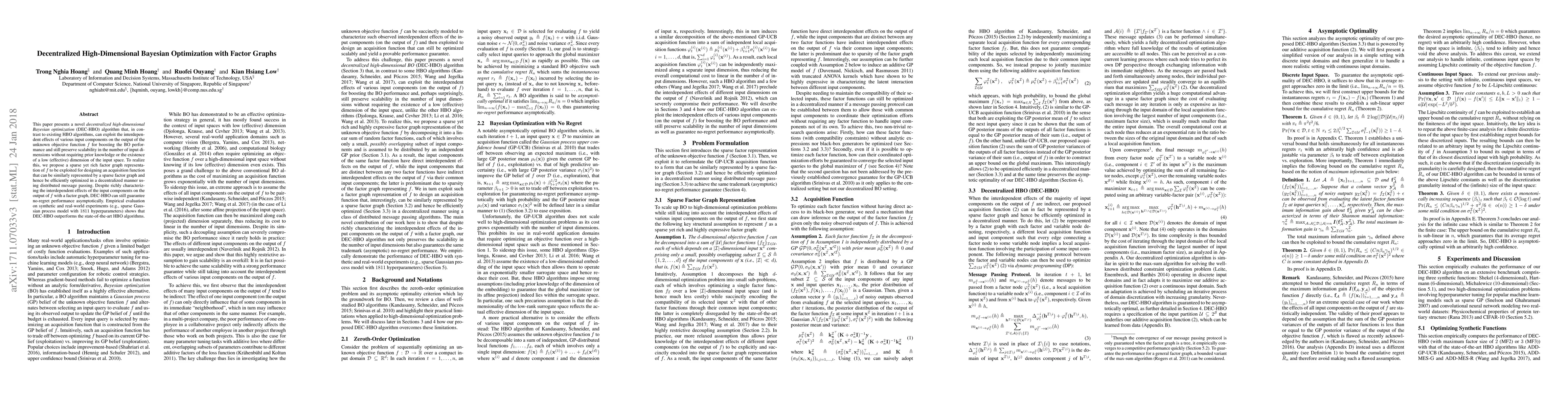 This research introduces DEC-HBO, a decentralized Bayesian optimization algorithm for high-dimensional functions, which efficiently exploits interdependent input effects via factor graphs. DEC-HBO outperforms existing methods in synthetic and real-world experiments, including a sparse Gaussian process model with 1811 hyperparameters, ensuring no-regret performance asymptotically without prior dimension knowledge.