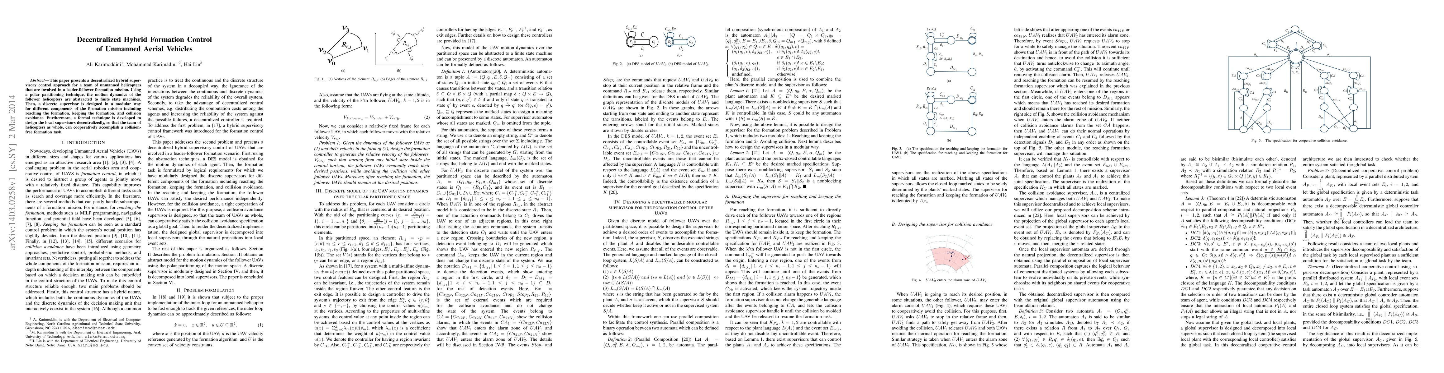 This paper presents a decentralized hybrid supervisory control approach for a team of unmanned helicopters that are involved in a leader-follower formation mission. Using a polar partitioning technique, the motion dynamics of the follower helicopters are abstracted to finite state machines. Then, a discrete supervisor is designed in a modular way for different components of the formation mission including reaching the formation, keeping the formation, and collision avoidance. Furthermore, a formal technique is developed to design the local supervisors decentralizedly, so that the team of helicopters as whole, can cooperatively accomplish a collision-free formation task.