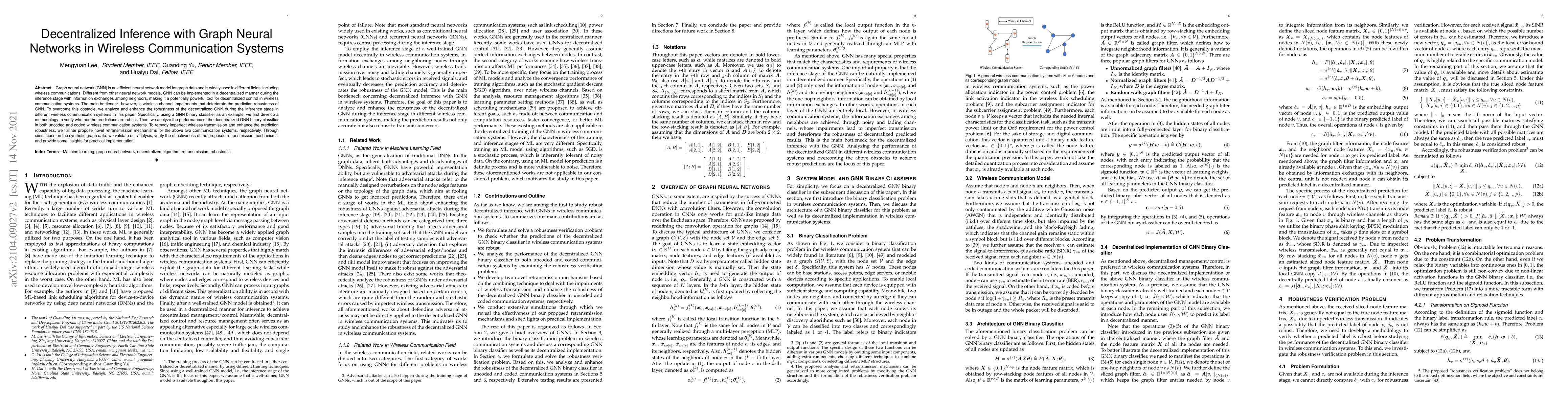 Graph neural network (GNN) is an efficient neural network model for graph data and is widely used in different fields, including wireless communications. Different from other neural network models, GNN can be implemented in a decentralized manner with information exchanges among neighbors, making it a potentially powerful tool for decentralized control in wireless communication systems. The main bottleneck, however, is wireless channel impairments that deteriorate the prediction robustness of GNN. To overcome this obstacle, we analyze and enhance the robustness of the decentralized GNN in different wireless communication systems in this paper. Specifically, using a GNN binary classifier as an example, we first develop a methodology to verify whether the predictions are robust. Then, we analyze the performance of the decentralized GNN binary classifier in both uncoded and coded wireless communication systems. To remedy imperfect wireless transmission and enhance the prediction robustness, we further propose novel retransmission mechanisms for the above two communication systems, respectively. Through simulations on the synthetic graph data, we validate our analysis, verify the effectiveness of the proposed retransmission mechanisms, and provide some insights for practical implementation.