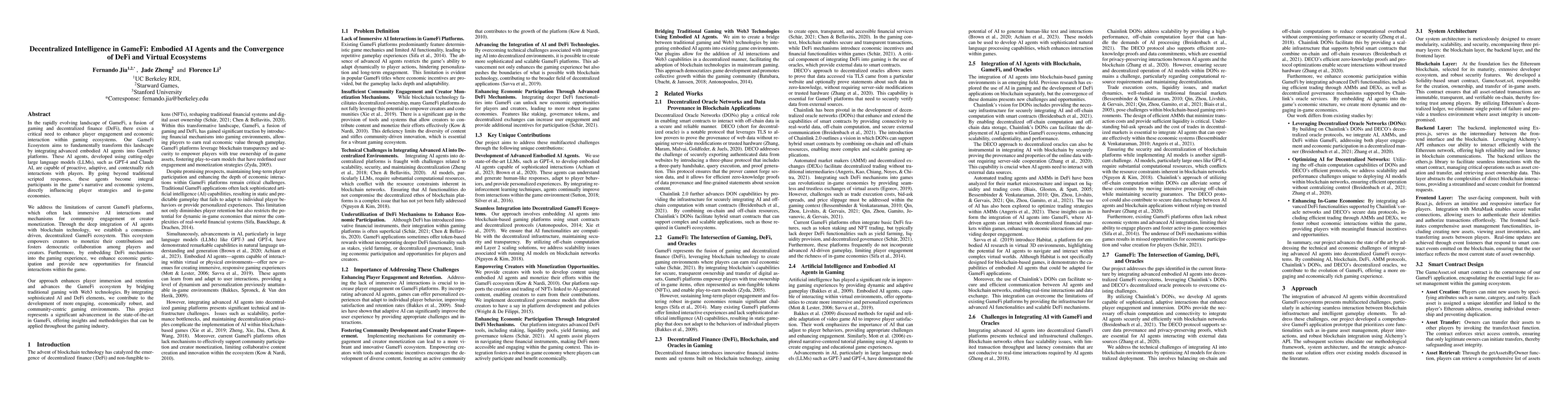 In the rapidly evolving landscape of GameFi, a fusion of gaming and decentralized finance (DeFi), there exists a critical need to enhance player engagement and economic interaction within gaming ecosystems. Our GameFi ecosystem aims to fundamentally transform this landscape by integrating advanced embodied AI agents into GameFi platforms. These AI agents, developed using cutting-edge large language models (LLMs), such as GPT-4 and Claude AI, are capable of proactive, adaptive, and contextually rich interactions with players. By going beyond traditional scripted responses, these agents become integral participants in the game's narrative and economic systems, directly influencing player strategies and in-game economies. We address the limitations of current GameFi platforms, which often lack immersive AI interactions and mechanisms for community engagement or creator monetization. Through the deep integration of AI agents with blockchain technology, we establish a consensus-driven, decentralized GameFi ecosystem. This ecosystem empowers creators to monetize their contributions and fosters democratic collaboration among players and creators. Furthermore, by embedding DeFi mechanisms into the gaming experience, we enhance economic participation and provide new opportunities for financial interactions within the game. Our approach enhances player immersion and retention and advances the GameFi ecosystem by bridging traditional gaming with Web3 technologies. By integrating sophisticated AI and DeFi elements, we contribute to the development of more engaging, economically robust, and community-centric gaming environments. This project represents a significant advancement in the state-of-the-art in GameFi, offering insights and methodologies that can be applied throughout the gaming industry.