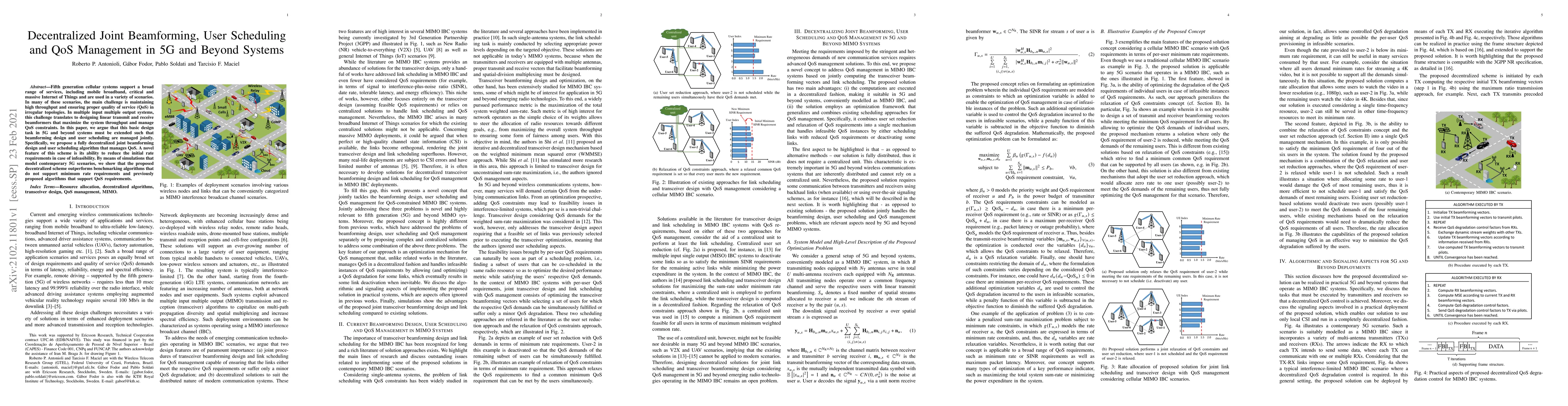 Fifth generation cellular systems support a broad range of services, including mobile broadband, critical and massive Internet of Things and are used in a variety of scenarios. In many of these scenarios, the main challenge is maintaining high throughput and ensuring proper quality of service (QoS) in irregular topologies. In multiple input multiple output systems, this challenge translates to designing linear transmit and receive beamformers that maximize the system throughput and manage QoS constraints. In this paper, we argue that this basic design task in 5G and beyond systems must be extended such that beamforming design and user scheduling are managed jointly. Specifically, we propose a fully decentralized joint beamforming design and user scheduling algorithm that manages QoS. A novel feature of this scheme is its ability to reduce the initial rate requirements in case of infeasibility. By means of simulations that model contemporary 5G scenarios, we show that the proposed decentralized scheme outperforms benchmarking algorithms that do not support minimum rate requirements and previously proposed algorithms that support QoS requirements.