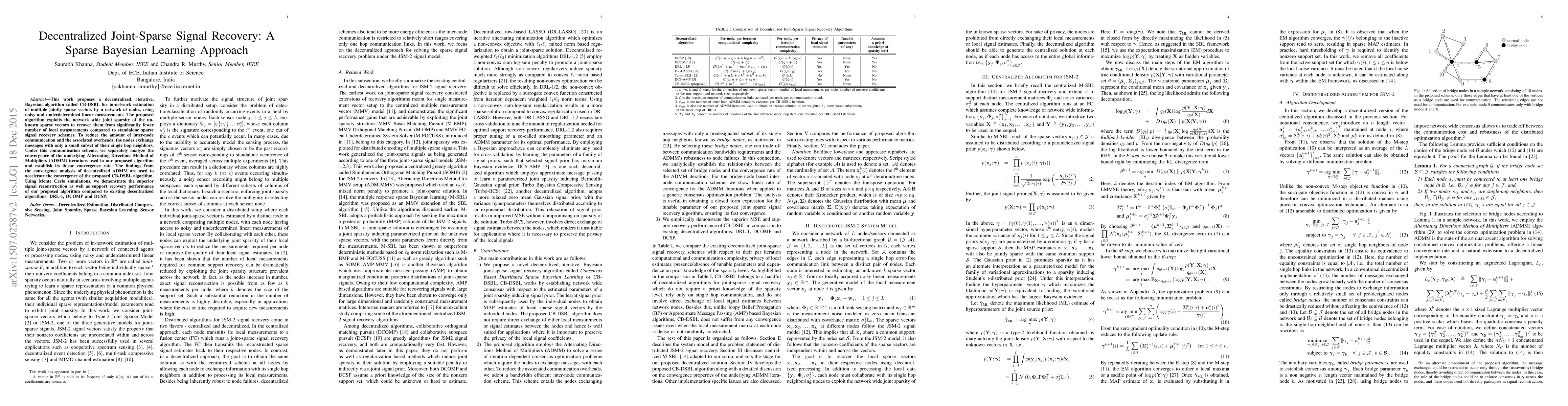 This work proposes a decentralized, iterative, Bayesian algorithm called CB-DSBL for in-network estimation of multiple jointly sparse vectors by a network of nodes, using noisy and underdetermined linear measurements. The proposed algorithm exploits the network wide joint sparsity of the un- known sparse vectors to recover them from significantly fewer number of local measurements compared to standalone sparse signal recovery schemes. To reduce the amount of inter-node communication and the associated overheads, the nodes exchange messages with only a small subset of their single hop neighbors. Under this communication scheme, we separately analyze the convergence of the underlying Alternating Directions Method of Multipliers (ADMM) iterations used in our proposed algorithm and establish its linear convergence rate. The findings from the convergence analysis of decentralized ADMM are used to accelerate the convergence of the proposed CB-DSBL algorithm. Using Monte Carlo simulations, we demonstrate the superior signal reconstruction as well as support recovery performance of our proposed algorithm compared to existing decentralized algorithms: DRL-1, DCOMP and DCSP.