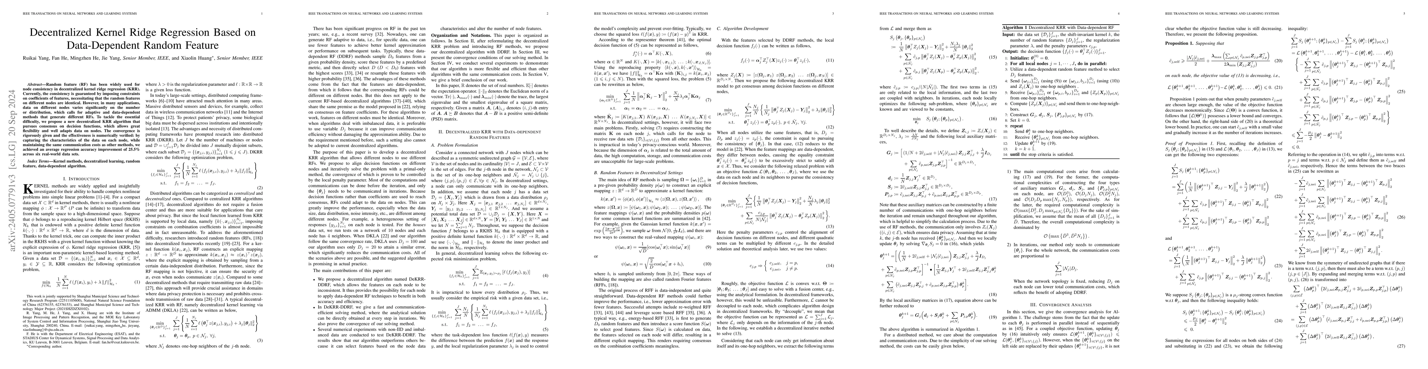 This paper proposes a decentralized kernel ridge regression algorithm that uses data-dependent random features to adapt to varying data distributions across nodes. It achieves consensus on decision functions, resulting in an average 25.5% improvement in regression accuracy across six datasets while maintaining communication costs comparable to other methods.