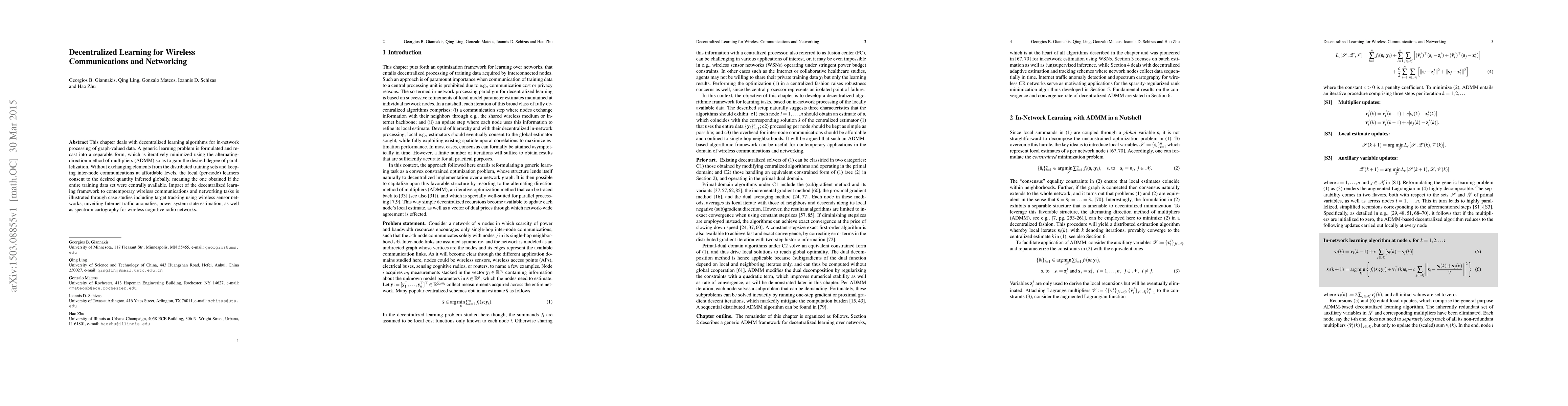 This chapter deals with decentralized learning algorithms for in-network processing of graph-valued data. A generic learning problem is formulated and recast into a separable form, which is iteratively minimized using the alternating-direction method of multipliers (ADMM) so as to gain the desired degree of parallelization. Without exchanging elements from the distributed training sets and keeping inter-node communications at affordable levels, the local (per-node) learners consent to the desired quantity inferred globally, meaning the one obtained if the entire training data set were centrally available. Impact of the decentralized learning framework to contemporary wireless communications and networking tasks is illustrated through case studies including target tracking using wireless sensor networks, unveiling Internet traffic anomalies, power system state estimation, as well as spectrum cartography for wireless cognitive radio networks.