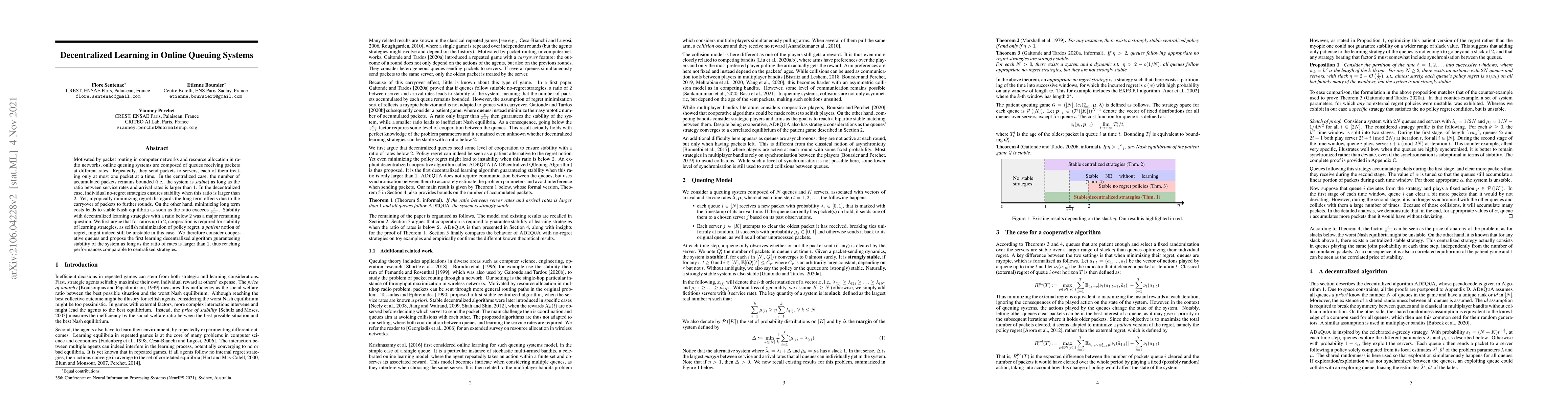 Motivated by packet routing in computer networks, online queuing systems are composed of queues receiving packets at different rates. Repeatedly, they send packets to servers, each of them treating only at most one packet at a time. In the centralized case, the number of accumulated packets remains bounded (i.e., the system is \textit{stable}) as long as the ratio between service rates and arrival rates is larger than $1$. In the decentralized case, individual no-regret strategies ensures stability when this ratio is larger than $2$. Yet, myopically minimizing regret disregards the long term effects due to the carryover of packets to further rounds. On the other hand, minimizing long term costs leads to stable Nash equilibria as soon as the ratio exceeds $\frac{e}{e-1}$. Stability with decentralized learning strategies with a ratio below $2$ was a major remaining question. We first argue that for ratios up to $2$, cooperation is required for stability of learning strategies, as selfish minimization of policy regret, a \textit{patient} notion of regret, might indeed still be unstable in this case. We therefore consider cooperative queues and propose the first learning decentralized algorithm guaranteeing stability of the system as long as the ratio of rates is larger than $1$, thus reaching performances comparable to centralized strategies.