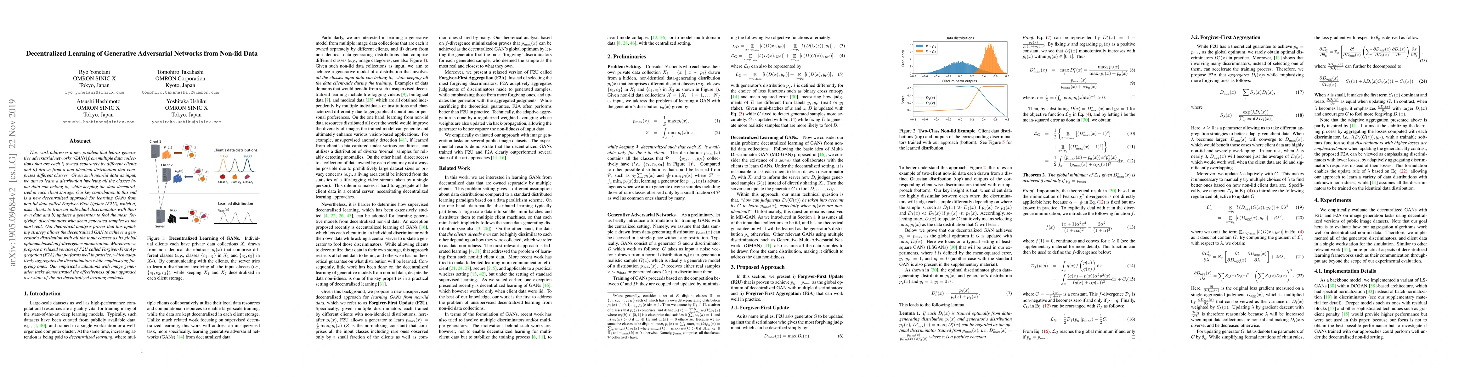 This paper proposes a decentralized learning method called Forgiver-First Update (F2U) for training GANs on non-iid data from multiple clients, aiming to achieve a generator's distribution encompassing all input classes. The F2U approach updates a generator to fool the most 'forgiving' discriminators, and empirical evaluations show its effectiveness over existing methods.