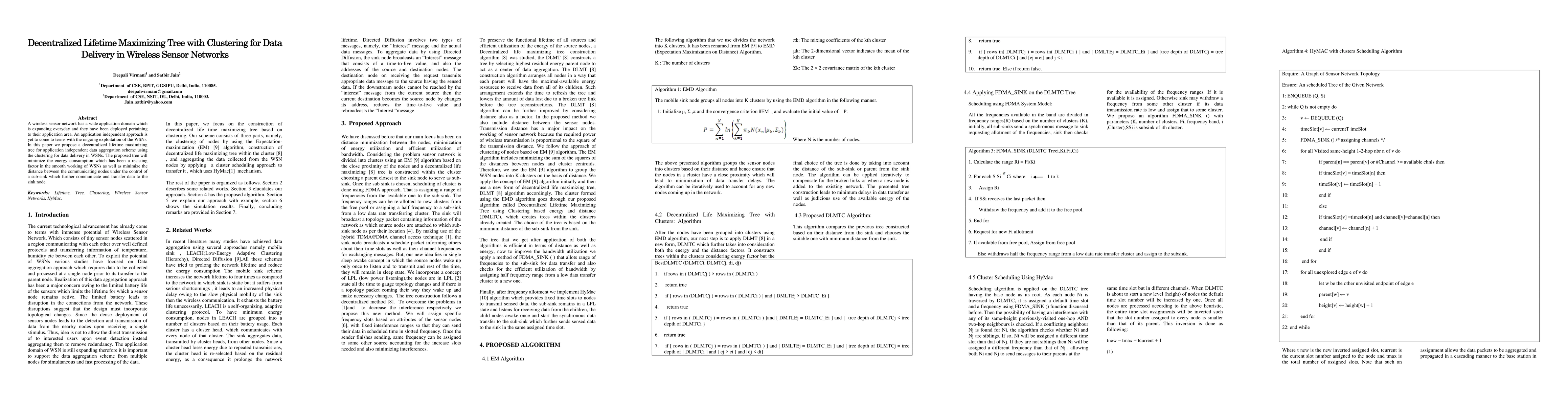 A wireless sensor network has a wide application domain which is expanding everyday and they have been deployed pertaining to their application area. An application independent approach is yet to come to terms with the ongoing exploitation of the WSNs. In this paper we propose a decentralized lifetime maximizing tree for application independent data aggregation scheme using the clustering for data delivery in WSNs. The proposed tree will minimize the energy consumption which has been a resisting factor in the smooth working of WSNs as well as minimize the distance between the communicating nodes under the control of a sub-sink which further communicate and transfer data to the sink node.