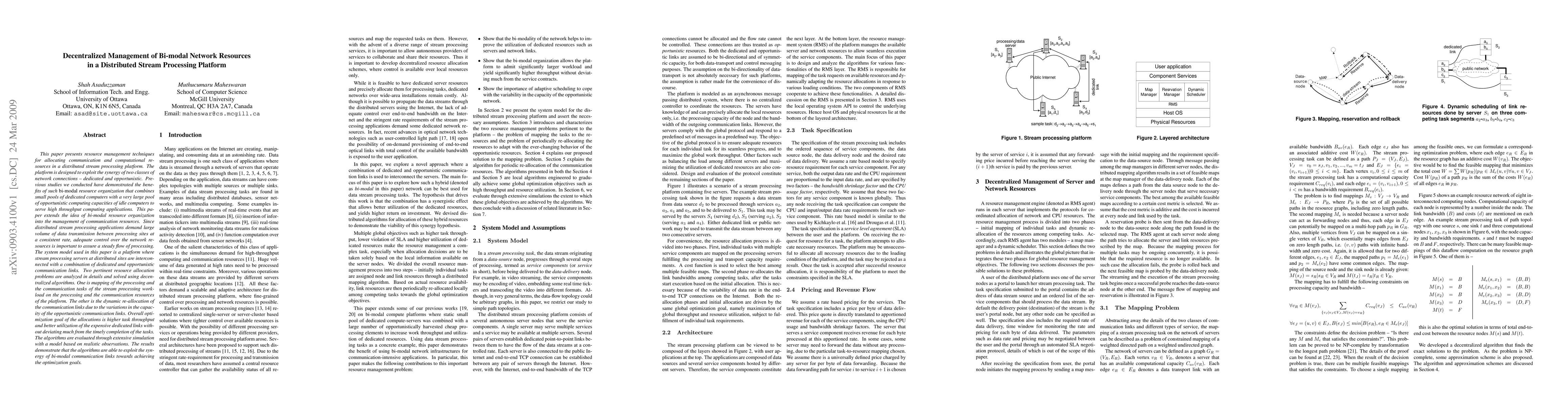 This paper introduces decentralized resource management techniques for a distributed stream processing platform that utilizes both dedicated and opportunistic network resources. The proposed algorithms optimize task mapping and adaptively reallocate opportunistic links to maximize throughput and dedicated link utilization.