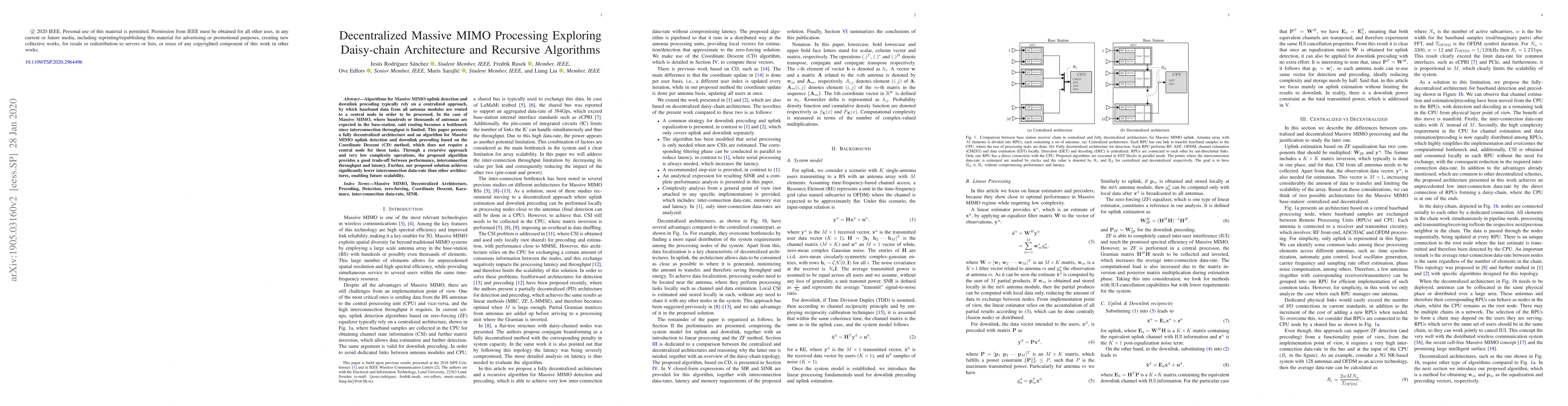 Algorithms for Massive MIMO uplink detection and downlink precoding typically rely on a centralized approach, by which baseband data from all antenna modules are routed to a central node in order to be processed. In the case of Massive MIMO, where hundreds or thousands of antennas are expected in the base-station, said routing becomes a bottleneck since interconnection throughput is limited. This paper presents a fully decentralized architecture and an algorithm for Massive MIMO uplink detection and downlink precoding based on the Stochastic Gradient Descent (SGD) method, which does not require a central node for these tasks. Through a recursive approach and very low complexity operations, the proposed algorithm provides a good trade-off between performance, interconnection throughput and latency. Further, our proposed solution achieves significantly lower interconnection data-rate than other architectures, enabling future scalability.