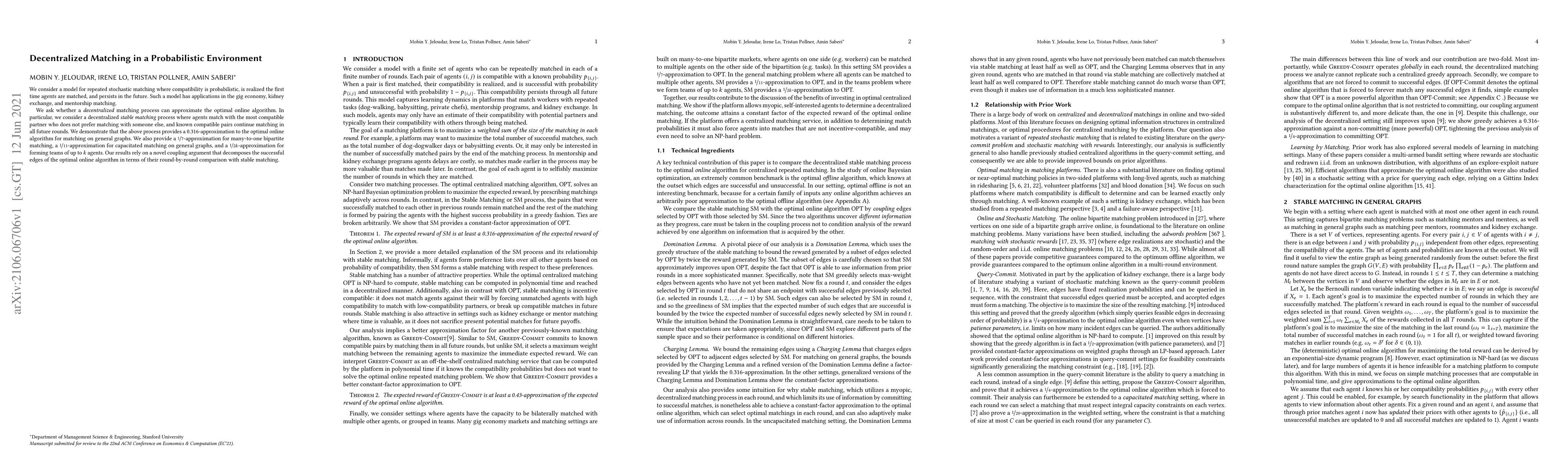 Researchers developed a decentralized matching process that approximates an optimal online algorithm for various matchings scenarios with high accuracy, including 0.316-approximation for general graphs and up to 1/2k-approximation for team formation.