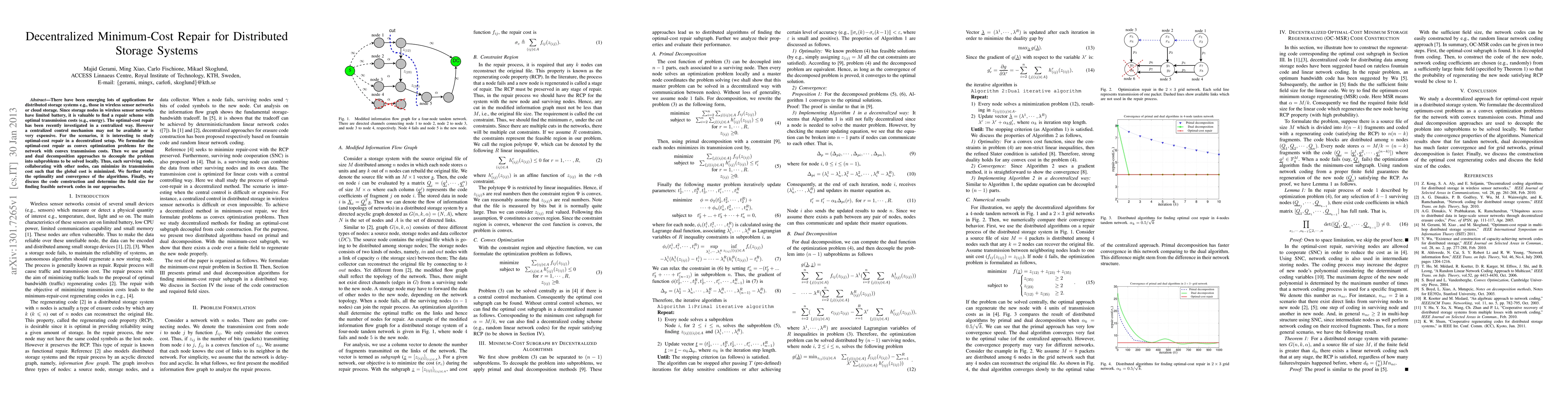 This paper proposes decentralized algorithms for minimum-cost repair in distributed storage systems, focusing on scenarios with limited node resources. It formulates the problem as convex optimization and uses primal and dual decomposition to enable local, collaborative solutions that minimize global transmission costs.