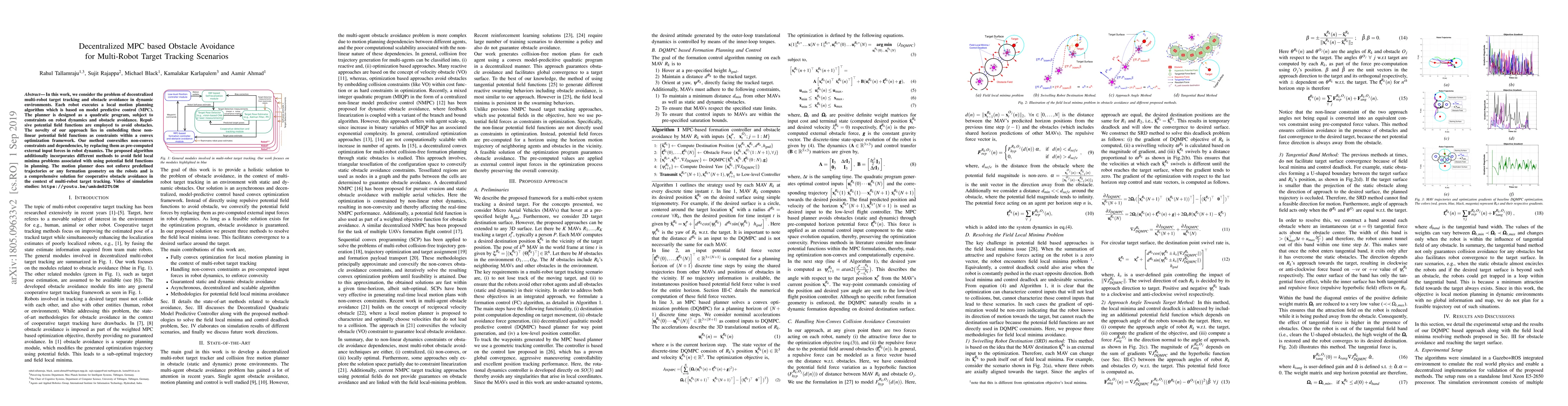 This paper proposes a decentralized model predictive control (MPC) approach for multi-robot target tracking and obstacle avoidance in dynamic environments, embedding non-linear potential field functions as convex optimization constraints to handle non-convex dependencies. Simulation studies demonstrate effective convergence and avoidance of local minima in various scenarios.
