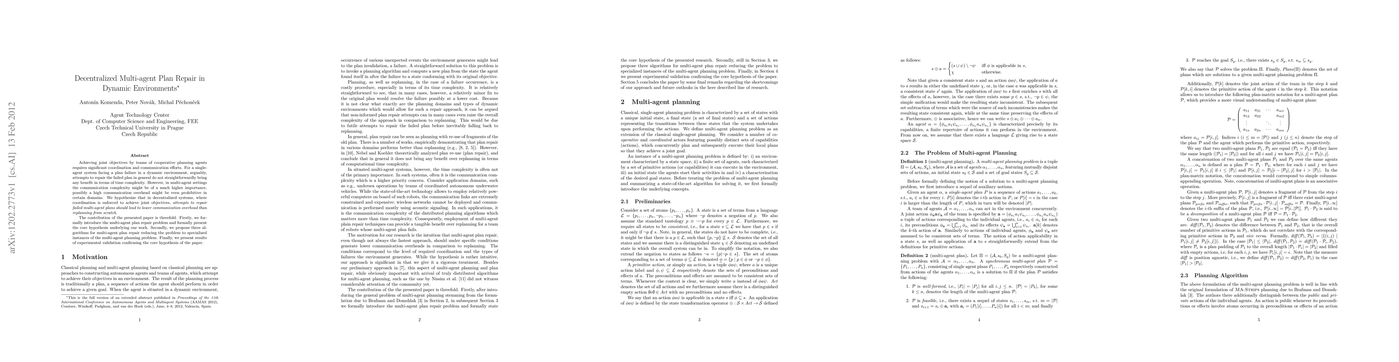 This paper introduces the multi-agent plan repair problem in decentralized systems, proposing three algorithms to reduce communication overhead compared to replanning from scratch. Experimental results validate the hypothesis that plan repair can achieve lower communication complexity than complete replanning.