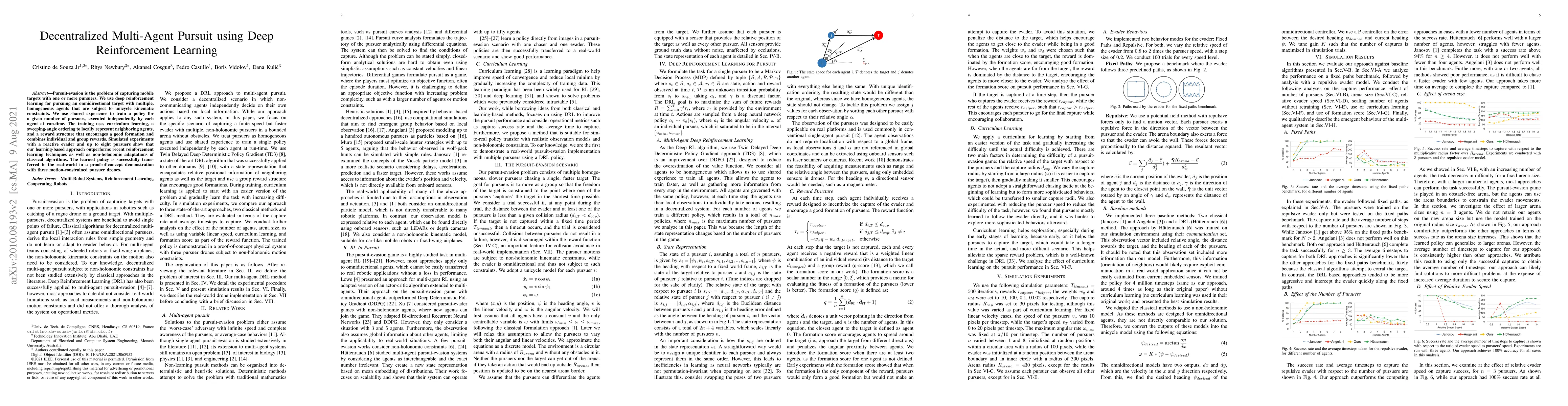 This paper explores decentralized multi-agent pursuit using deep reinforcement learning, achieving comparable performance to classical algorithms in simulations and demonstrating successful real-world transfer with motion-constrained drones. The approach leverages shared experience, curriculum learning, and a reward structure to optimize agent coordination and formation.