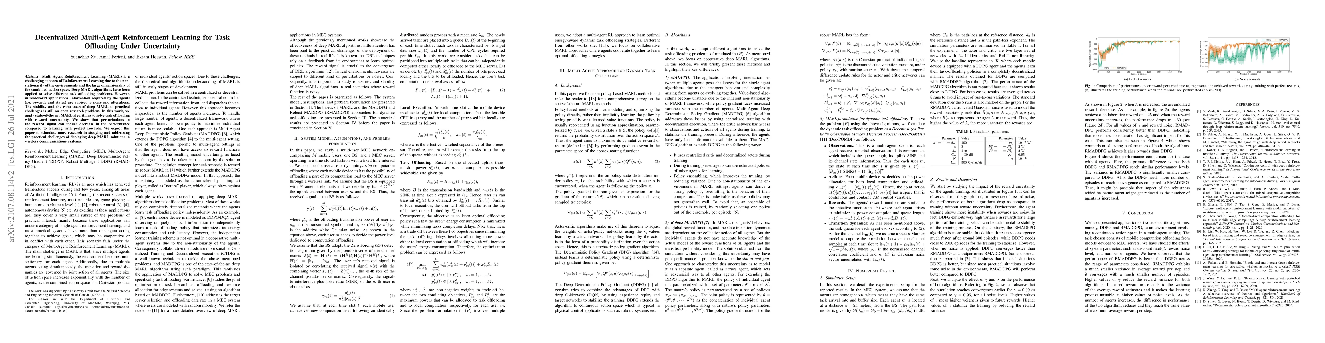 This paper explores decentralized Multi-Agent Reinforcement Learning (MARL) for task offloading under reward uncertainty, demonstrating that perturbations in reward signals can degrade performance. The study aims to highlight practical challenges in deploying deep MARL in wireless communications, encouraging further research in this area.