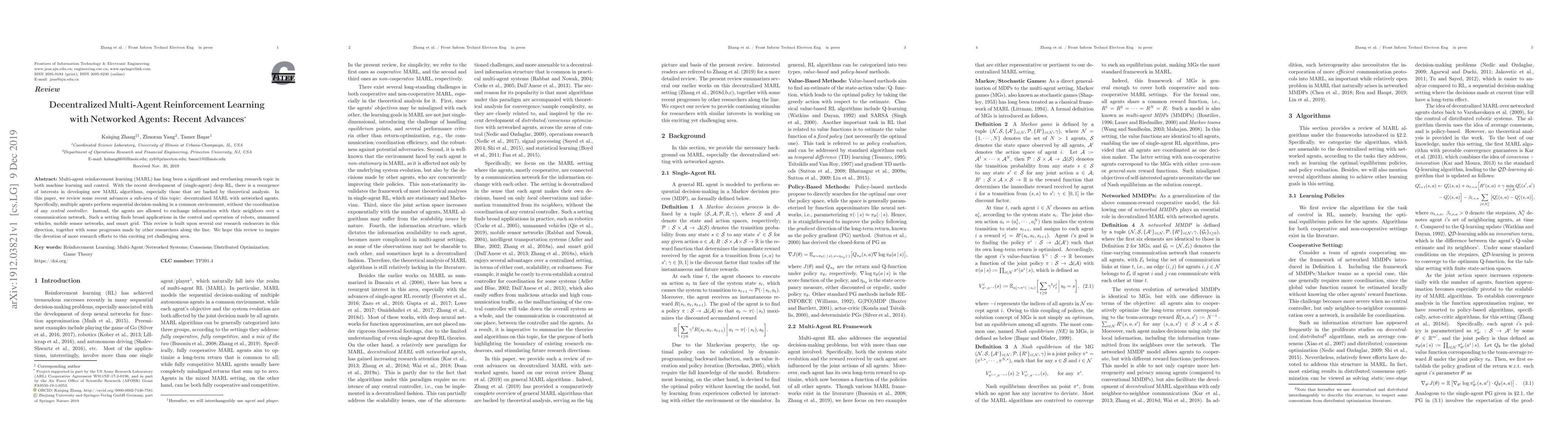 Multi-agent reinforcement learning (MARL) has long been a significant and everlasting research topic in both machine learning and control. With the recent development of (single-agent) deep RL, there is a resurgence of interests in developing new MARL algorithms, especially those that are backed by theoretical analysis. In this paper, we review some recent advances a sub-area of this topic: decentralized MARL with networked agents. Specifically, multiple agents perform sequential decision-making in a common environment, without the coordination of any central controller. Instead, the agents are allowed to exchange information with their neighbors over a communication network. Such a setting finds broad applications in the control and operation of robots, unmanned vehicles, mobile sensor networks, and smart grid. This review is built upon several our research endeavors in this direction, together with some progresses made by other researchers along the line. We hope this review to inspire the devotion of more research efforts to this exciting yet challenging area.