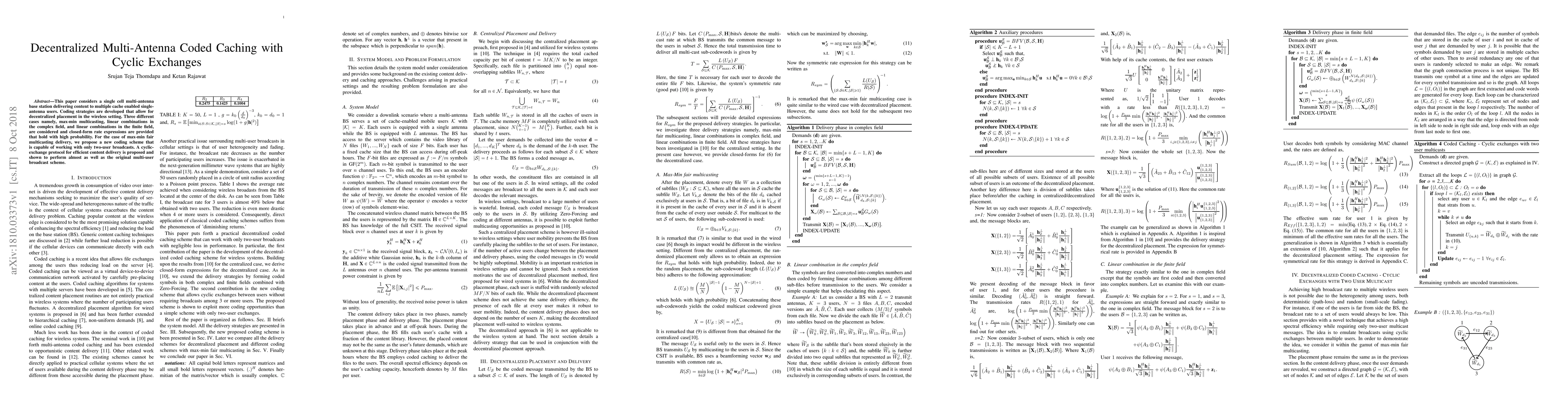 This paper considers a single cell multi-antenna base station delivering content to multiple cache enabled single-antenna users. Coding strategies are developed that allow for decentralized placement in the wireless setting. Three different cases namely, max-min multicasting, linear combinations in the complex field, and linear combinations in the finite field, are considered and closed-form rate expressions are provided that hold with high probability. For the case of max-min fair multicasting delivery, we propose a new coding scheme that is capable of working with only two-user broadcasts. A cyclic-exchange protocol for efficient content delivery is proposed and shown to perform almost as well as the original multi-user broadcast scheme.