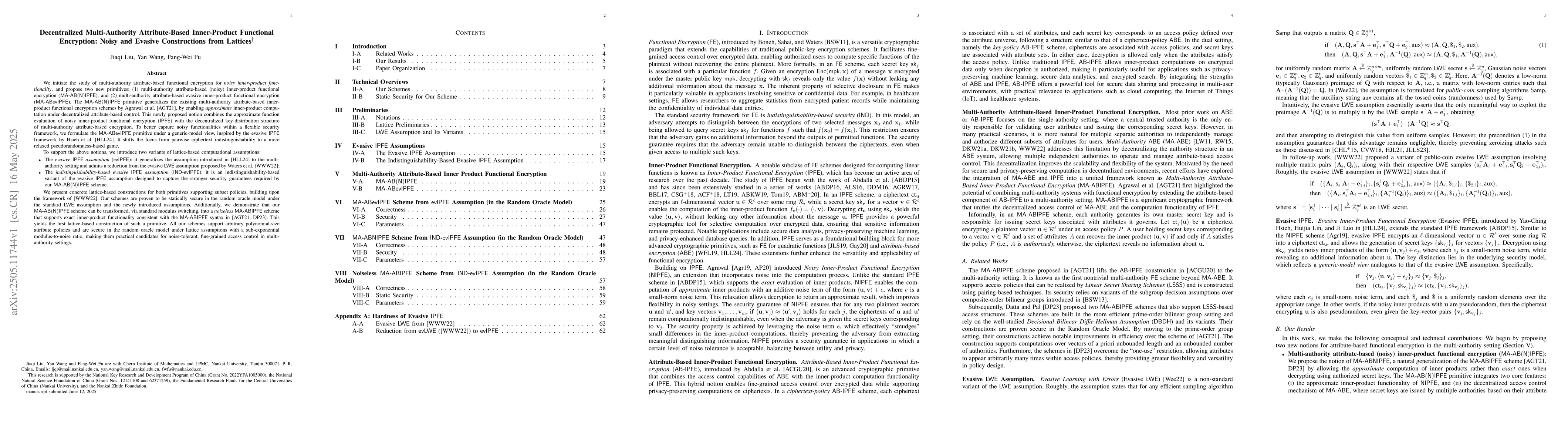 The paper introduces novel lattice-based constructions for decentralized multi-authority attribute-based inner-product functional encryption with noisy and evasive variants, along with modulus-switching techniques for noiseless inner-product functionality.