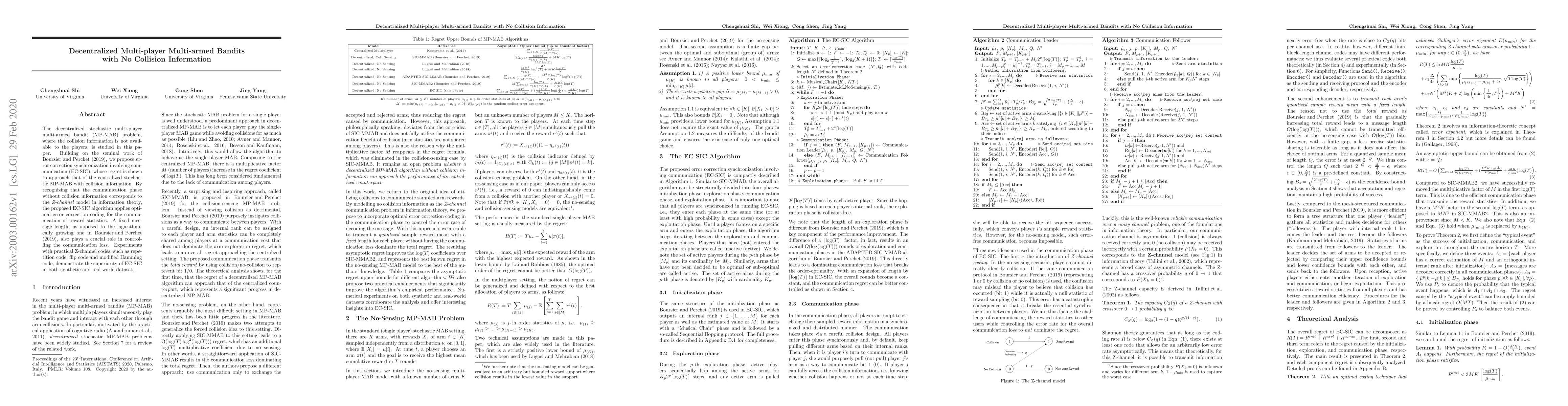 This paper proposes an error correction synchronization involving communication (EC-SIC) algorithm for decentralized multi-player multi-armed bandits without collision information, achieving regret close to centralized approaches. The EC-SIC algorithm uses optimal error correction coding and fixed message length, outperforming previous methods in both synthetic and real-world datasets.