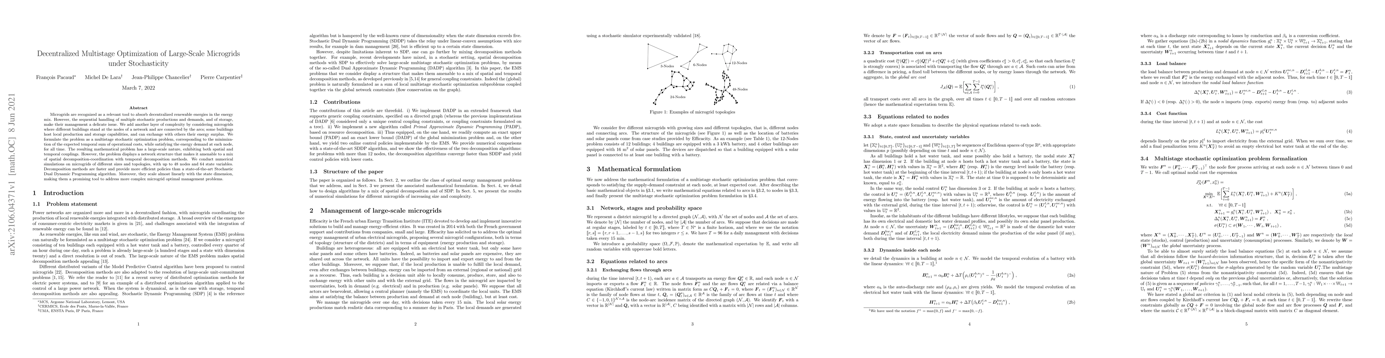 This paper proposes a decentralized multistage optimization approach to manage large-scale microgrids with stochastic energy production and demand. The method efficiently decomposes the problem into spatial and temporal parts, outperforming traditional algorithms and scaling well for complex systems.