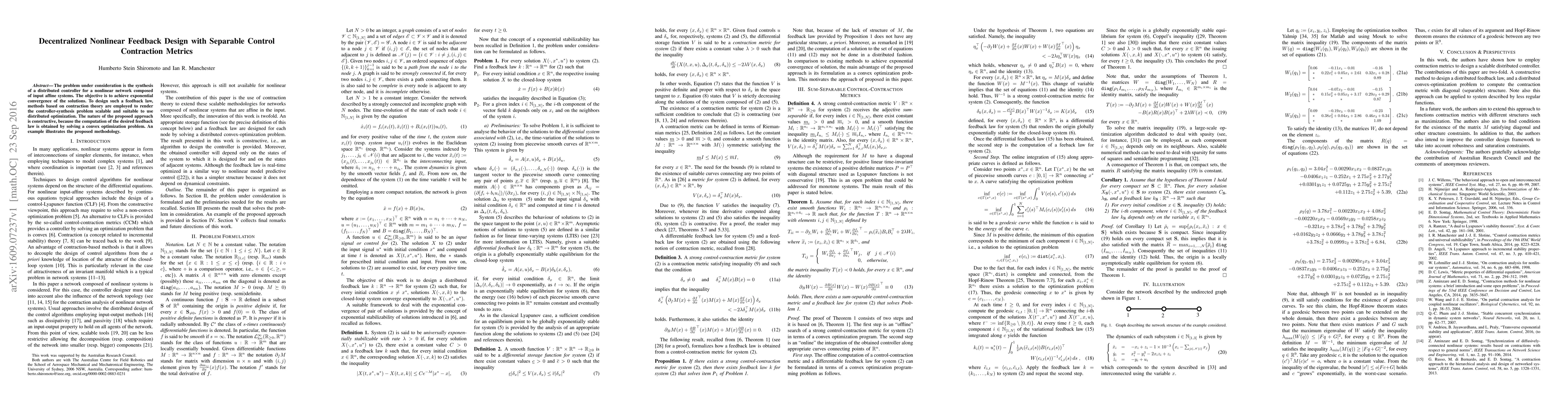 The problem under consideration is the synthesis of a distributed controller for a nonlinear network composed of input affine systems. The objective is to achieve exponential convergence of the solutions. To design such a feedback law, methods based on contraction theory are employed to render the controller-synthesis problem scalable and suitable to use distributed optimization. The nature of the proposed approach is constructive, because the computation of the desired feedback law is obtained by solving a convex optimization problem. An example illustrates the proposed methodology.