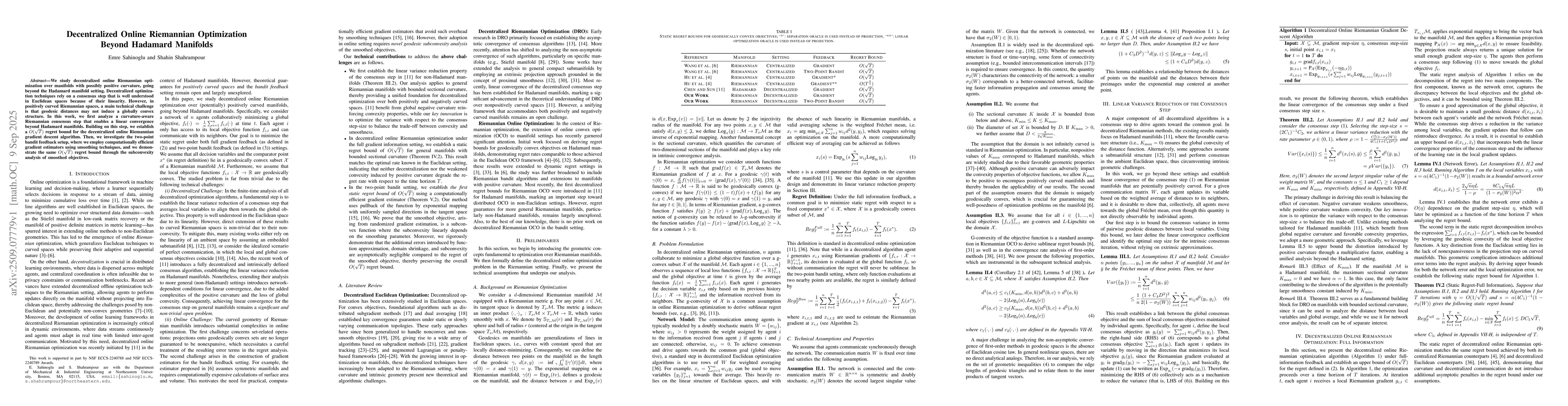 We study decentralized online Riemannian optimization over manifolds with possibly positive curvature, going beyond the Hadamard manifold setting. Decentralized optimization techniques rely on a consensus step that is well understood in Euclidean spaces because of their linearity. However, in positively curved Riemannian spaces, a main technical challenge is that geodesic distances may not induce a globally convex structure. In this work, we first analyze a curvature-aware Riemannian consensus step that enables a linear convergence beyond Hadamard manifolds. Building on this step, we establish a $O(\sqrt{T})$ regret bound for the decentralized online Riemannian gradient descent algorithm. Then, we investigate the two-point bandit feedback setup, where we employ computationally efficient gradient estimators using smoothing techniques, and we demonstrate the same $O(\sqrt{T})$ regret bound through the subconvexity analysis of smoothed objectives.