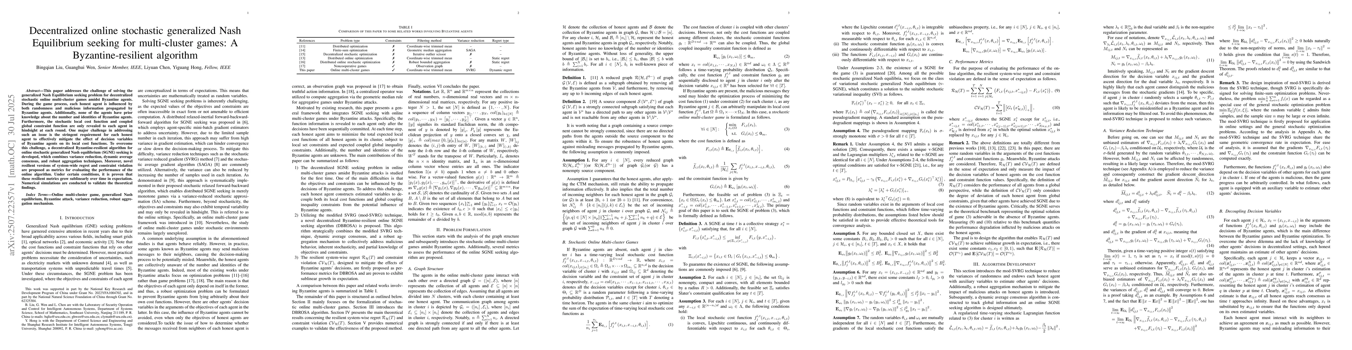 This research introduces a decentralized algorithm for solving the generalized Nash Equilibrium problem in stochastic, multi-cluster games involving Byzantine agents. The algorithm employs variance reduction, dynamic average consensus, and robust aggregation techniques to mitigate the impact of malicious agents. It also proposes new resilient metrics for evaluating performance, proven to grow sublinearly over time. Numerical simulations validate these findings.