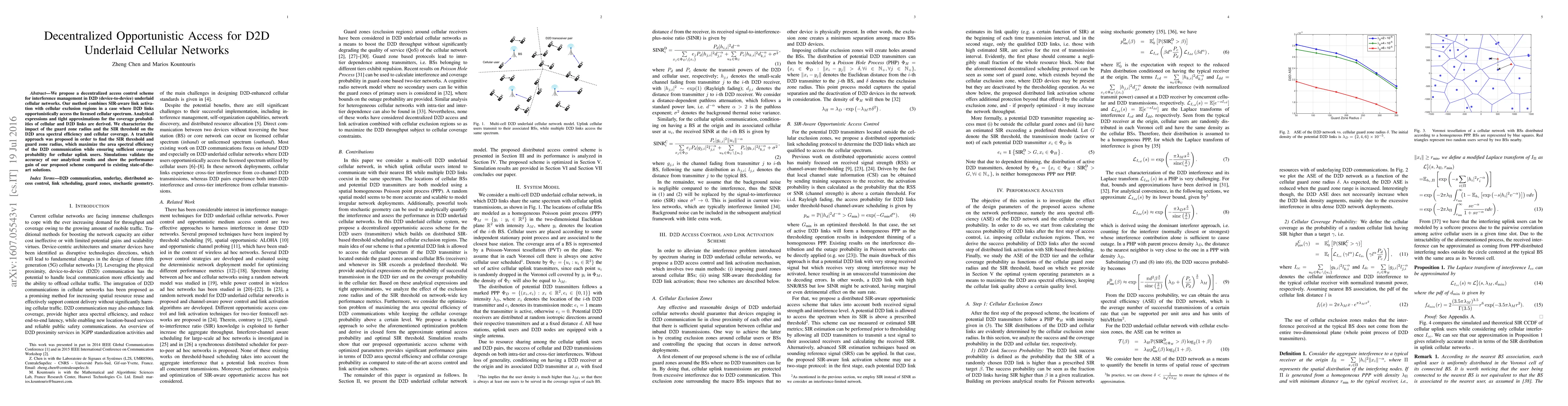 This paper proposes a decentralized access control scheme for managing interference in D2D underlaid cellular networks, combining SIR-aware link activation with cellular exclusion regions. Analytical expressions are derived to characterize the impact of guard zone radius and SIR threshold on D2D spectral efficiency and cellular coverage, with simulations validating the performance gains over existing methods.