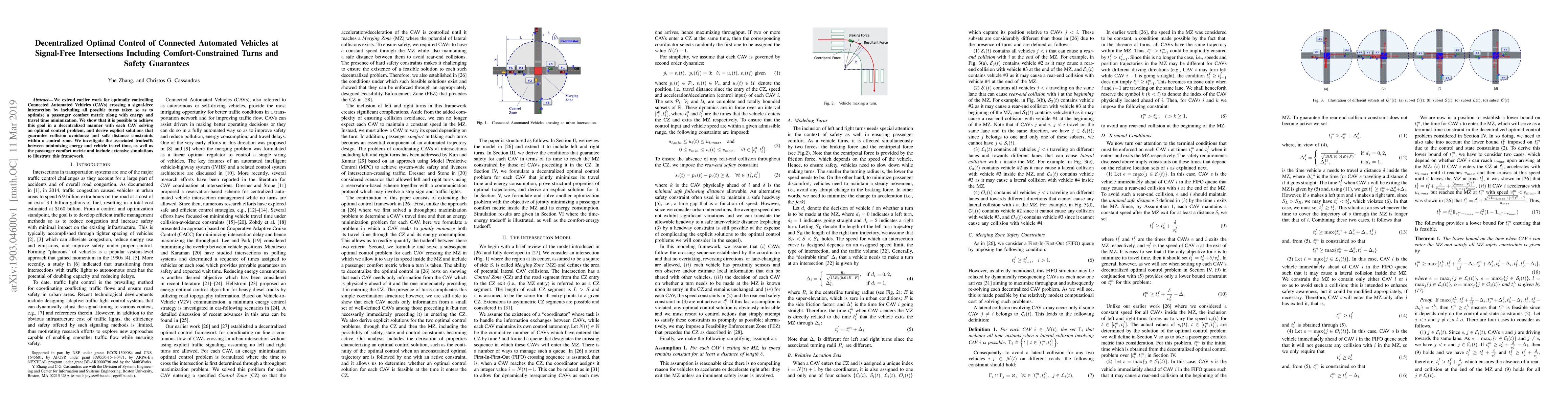 This paper proposes a decentralized optimal control framework for Connected Automated Vehicles (CAVs) at signal-free intersections, optimizing passenger comfort, energy, and travel time while ensuring safety through collision avoidance and maintaining safe distances. Extensive simulations demonstrate the effectiveness of the derived solutions.