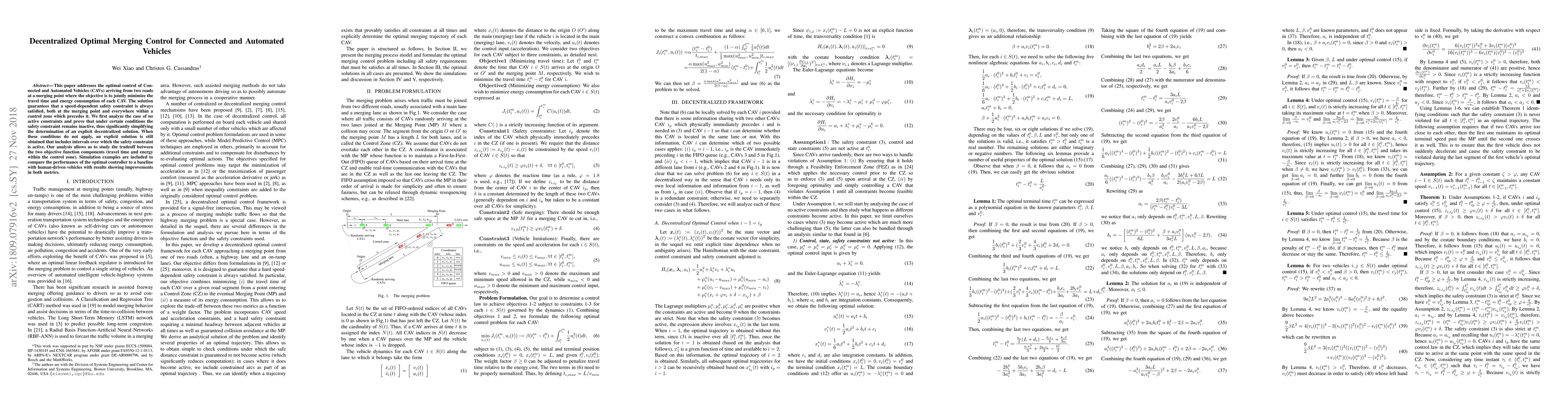This paper proposes a decentralized optimal merging control strategy for Connected and Automated Vehicles (CAVs) to minimize travel time and energy consumption while ensuring safety. The analysis provides explicit solutions under varying conditions, demonstrating improved performance compared to human-driven vehicles in simulations.