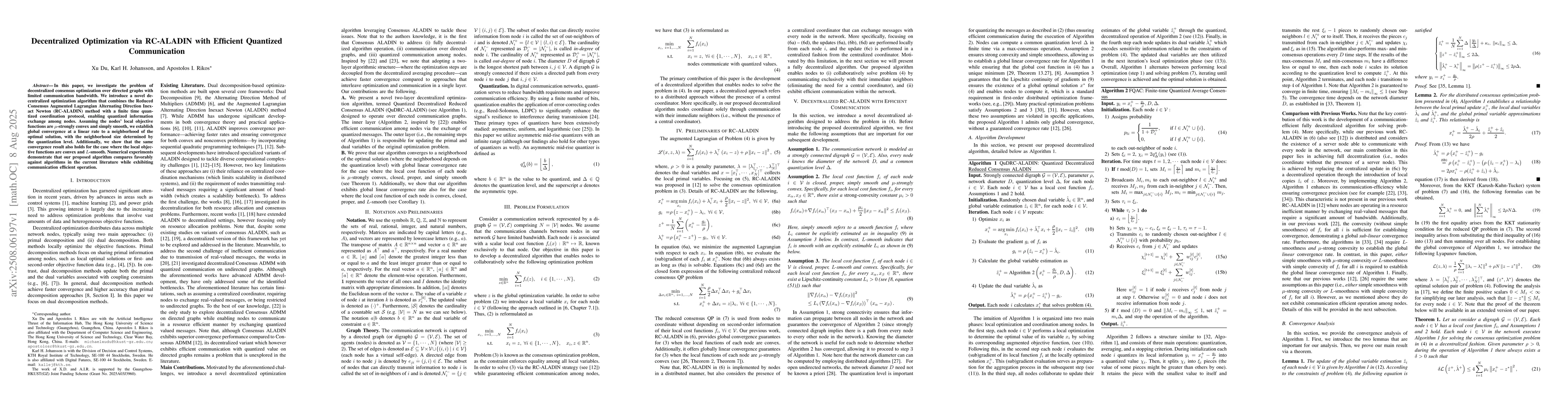 In this paper, we investigate the problem of decentralized consensus optimization over directed graphs with limited communication bandwidth. We introduce a novel decentralized optimization algorithm that combines the Reduced Consensus Augmented Lagrangian Alternating Direction Inexact Newton (RC-ALADIN) method with a finite time quantized coordination protocol, enabling quantized information exchange among nodes. Assuming the nodes' local objective functions are $\mu$-strongly convex and simply smooth, we establish global convergence at a linear rate to a neighborhood of the optimal solution, with the neighborhood size determined by the quantization level. Additionally, we show that the same convergence result also holds for the case where the local objective functions are convex and $L$-smooth. Numerical experiments demonstrate that our proposed algorithm compares favorably against algorithms in the current literature while exhibiting communication efficient operation.