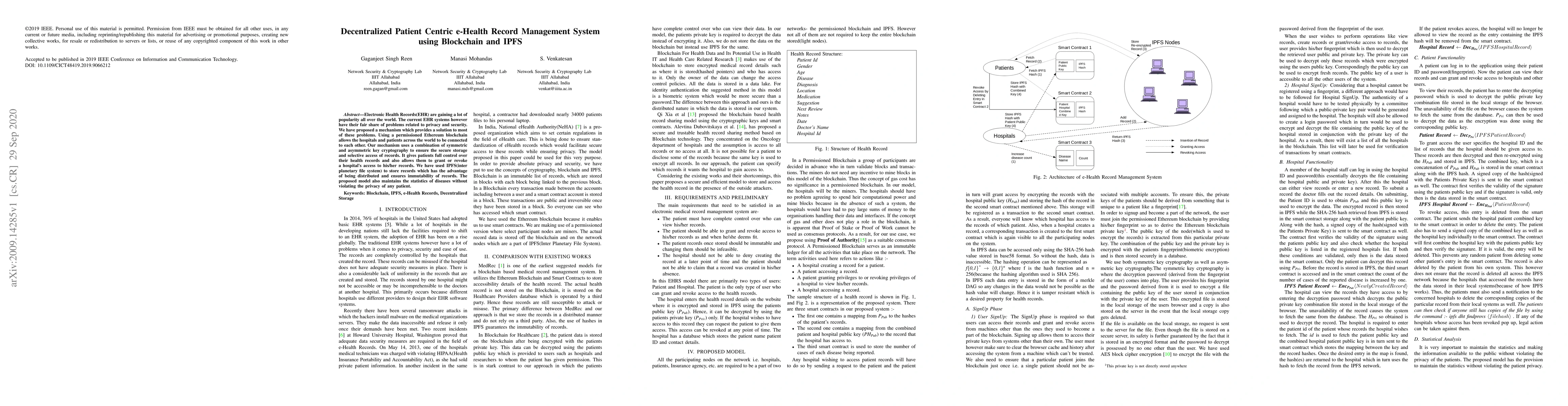 This paper proposes a decentralized e-Health Record Management System using blockchain and IPFS to address privacy and security issues in current EHR systems. The system leverages Ethereum blockchain and IPFS for secure, distributed, and immutable storage, granting patients full control over their records and access permissions.