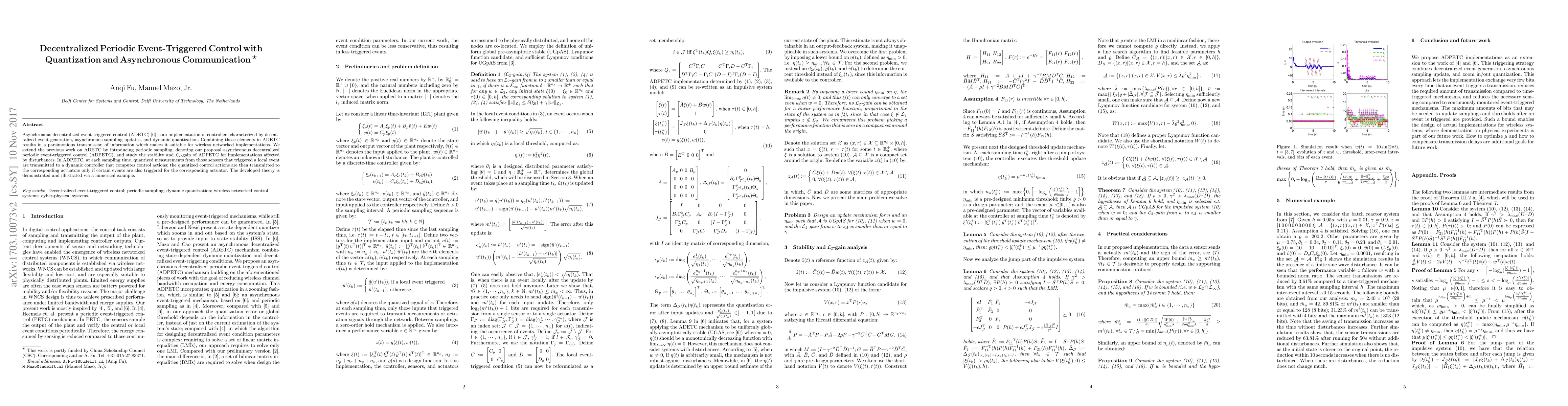 Asynchronous decentralized event-triggered control (ADETC) is an implementation of controllers characterized by decentralized event generation, asynchronous sampling updates, and dynamic quantization. Combining those elements in ADETC results in a parsimonious transmission of information which makes it suitable for wireless networked implementations. We extend the previous work on ADETC by introducing periodic sampling, denoting our proposal asynchronous decentralized periodic event-triggered control (ADPETC), and study the stability and L2-gain of ADPETC for implementations affected by disturbances. In ADPETC, at each sampling time, quantized measurements from those sensors that triggered a local event are transmitted to a dynamic controller that computes control actions; the quantized control actions are then transmitted to the corresponding actuators only if certain events are also triggered for the corresponding actuator. The developed theory is demonstrated and illustrated via a numerical example.