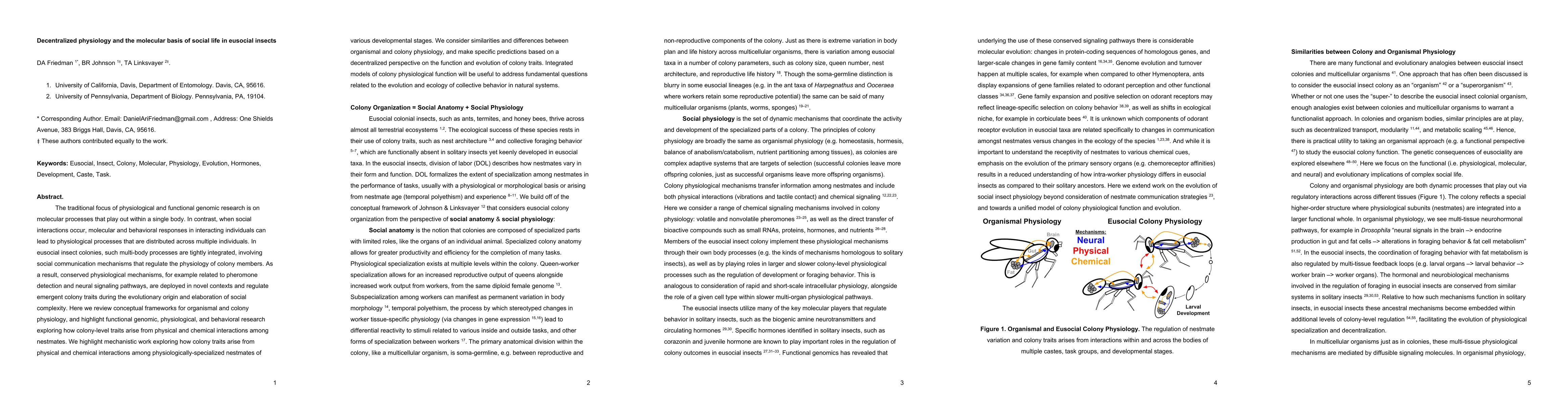 The traditional focus of physiological and functional genomic research is on molecular processes that play out within a single body. In contrast, when social interactions occur, molecular and behavioral responses in interacting individuals can lead to physiological processes that are distributed across multiple individuals. In eusocial insect colonies, such multi-body processes are tightly integrated, involving social communication mechanisms that regulate the physiology of colony members. As a result, conserved physiological mechanisms, for example related to pheromone detection and neural signaling pathways, are deployed in novel contexts and regulate emergent colony traits during the evolutionary origin and elaboration of social complexity. Here we review conceptual frameworks for organismal and colony physiology, and highlight functional genomic, physiological, and behavioral research exploring how colony-level traits arise from physical and chemical interactions among nestmates. We highlight mechanistic work exploring how colony traits arise from physical and chemical interactions among physiologically-specialized nestmates of various developmental stages. We consider similarities and differences between organismal and colony physiology, and make specific predictions based on a decentralized perspective on the function and evolution of colony traits. Integrated models of colony physiological function will be useful to address fundamental questions related to the evolution and ecology of collective behavior in natural systems.